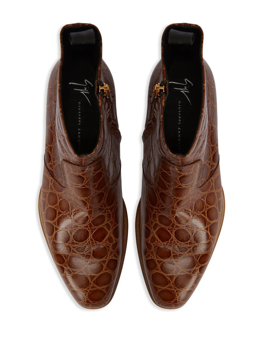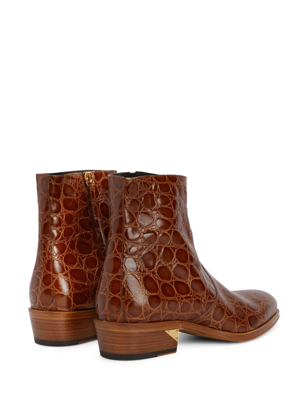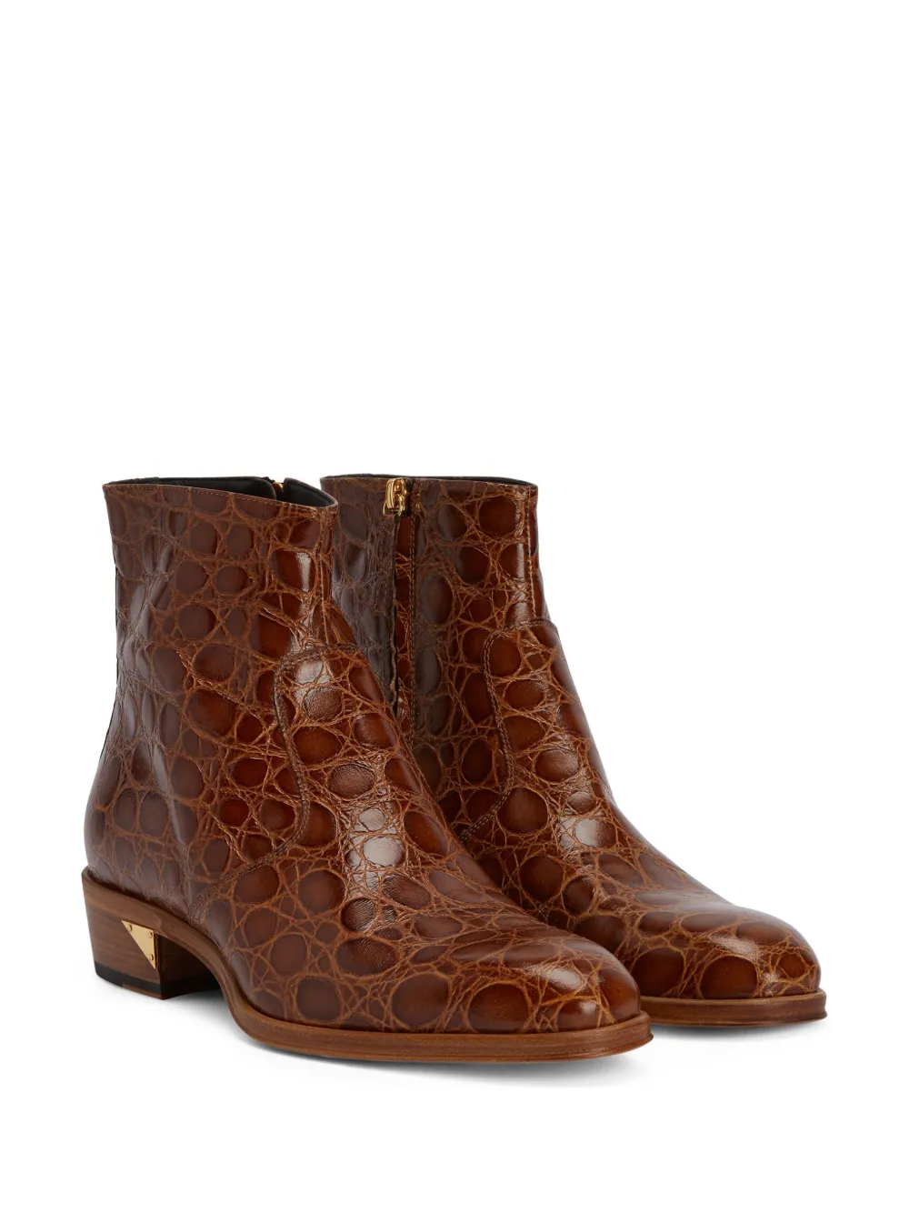 Коричневый, кожа, тиснение под кожу крокодила, золотистая фурнитура, петля для подтягивания сзади, застежка на молнии сбоку, высота по щиколотку, стелька с логотипом и кожаная подошва.