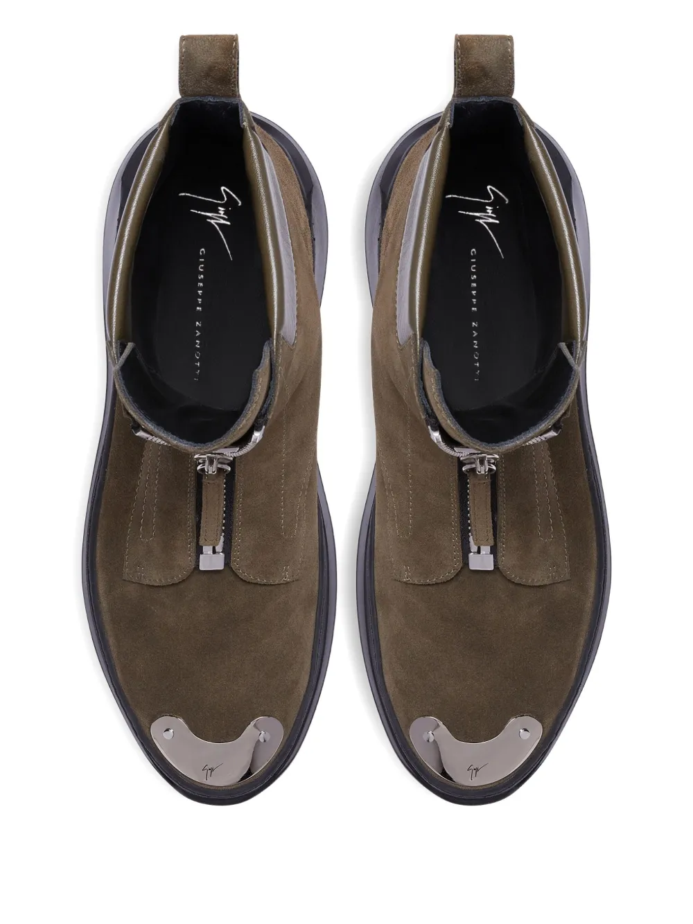 Хаки, замша, металлический логотип на язычке, носок с металлической накладкой, петля для подтягивания сзади, высота по щиколотку, закругленный носок, застежка на молнии спереди и плоская резиновая подошва.