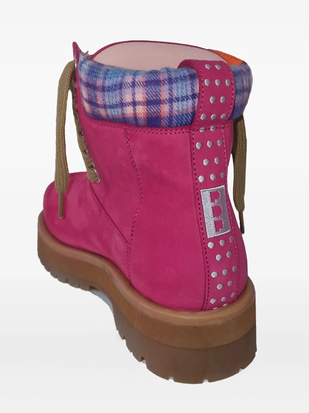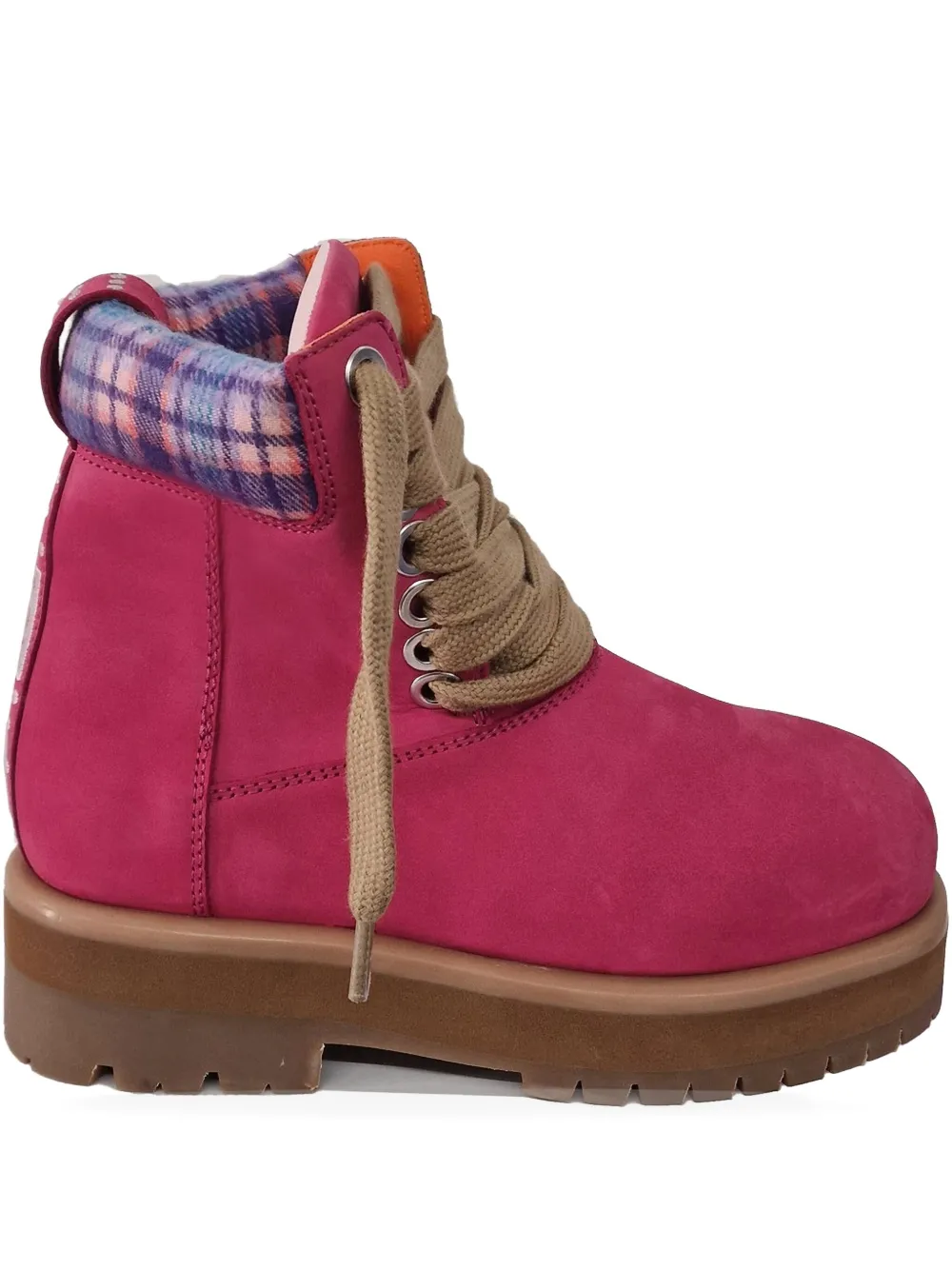 Розовая отделка в клетку, шнуровка, люверсы серебристого цвета, рифленая подошва, петля-задник