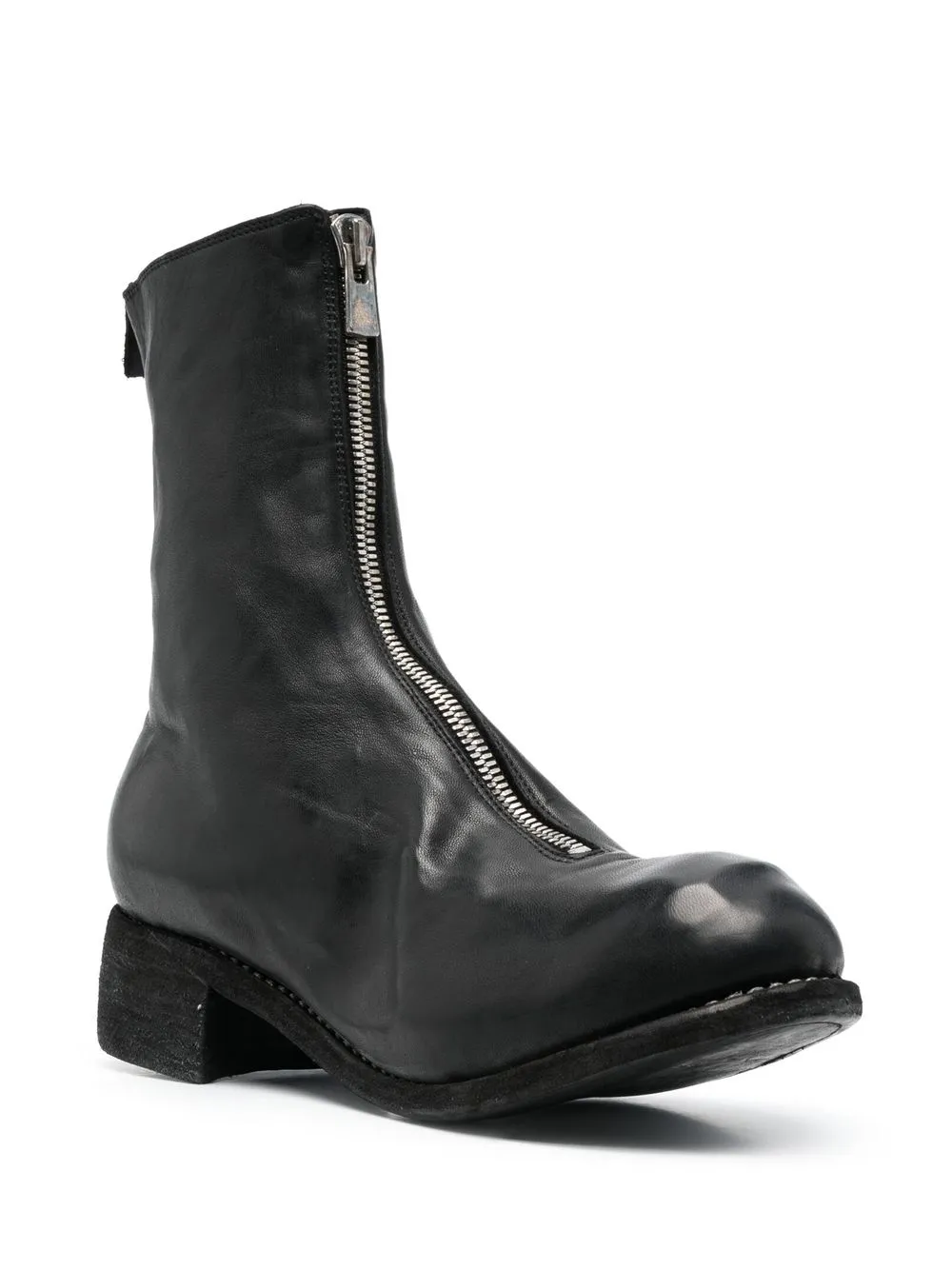 Черный, телячья кожа, закругленный носок, застежка на молнии спереди и длина до середины икры.