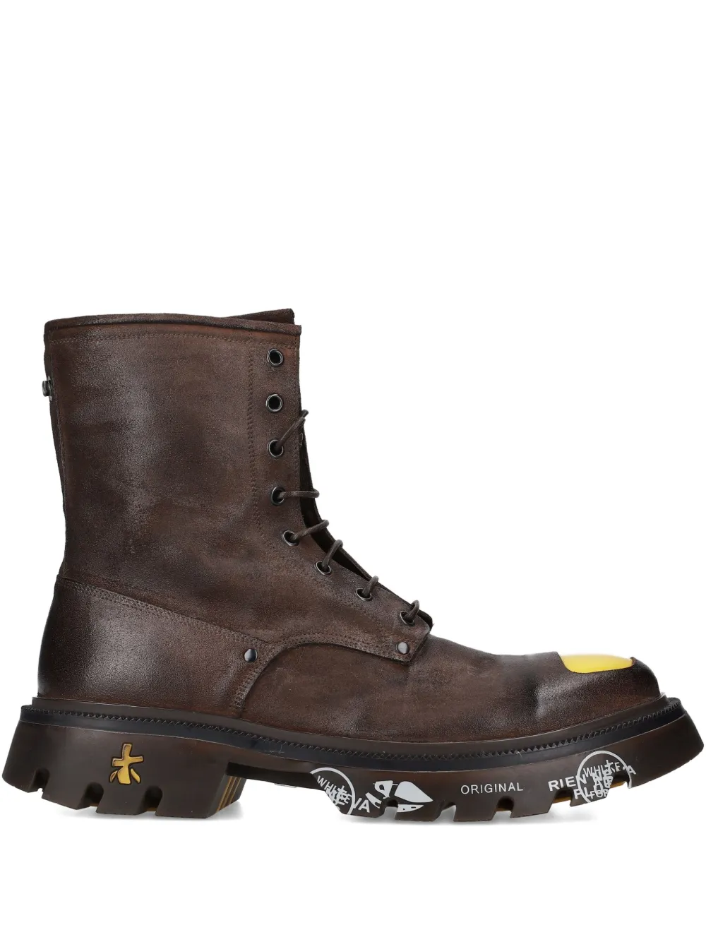 Коричневые ботинки на шнуровке, с боковой молнией, круглым носком, массивной подошвой и принтом на подошве