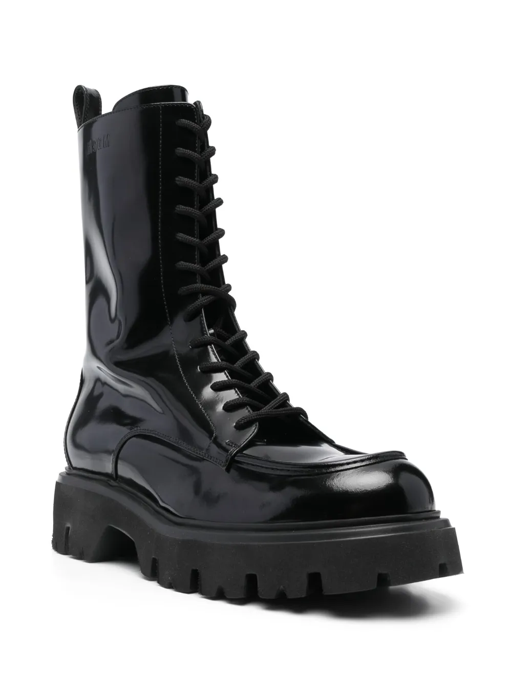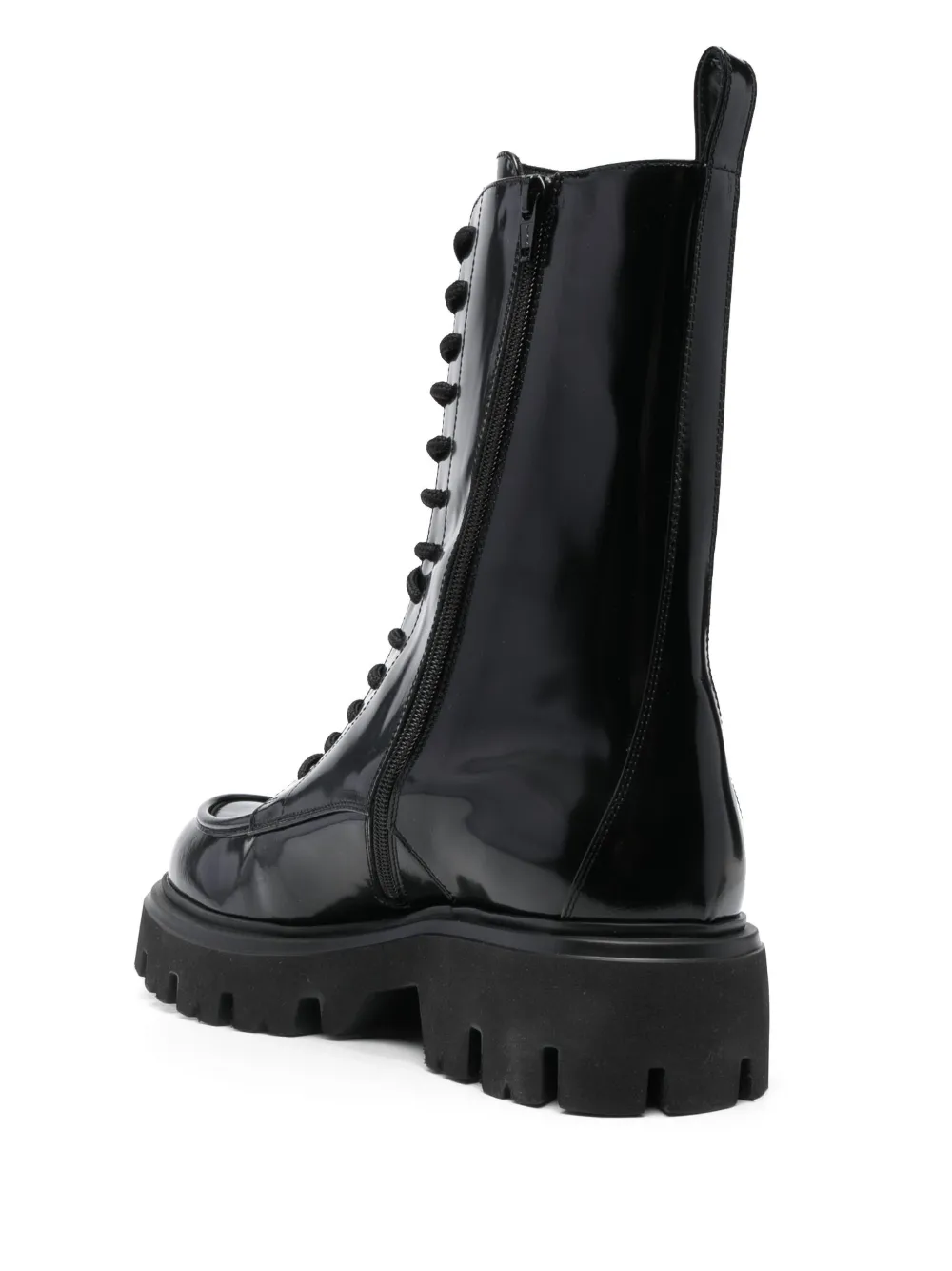 Черный, телячья кожа, высота по щиколотку, тисненый логотип сбоку, петля для подтягивания сзади, шнуровка спереди, застежка на молнии сбоку, закругленный носок и рифленая резиновая подошва.