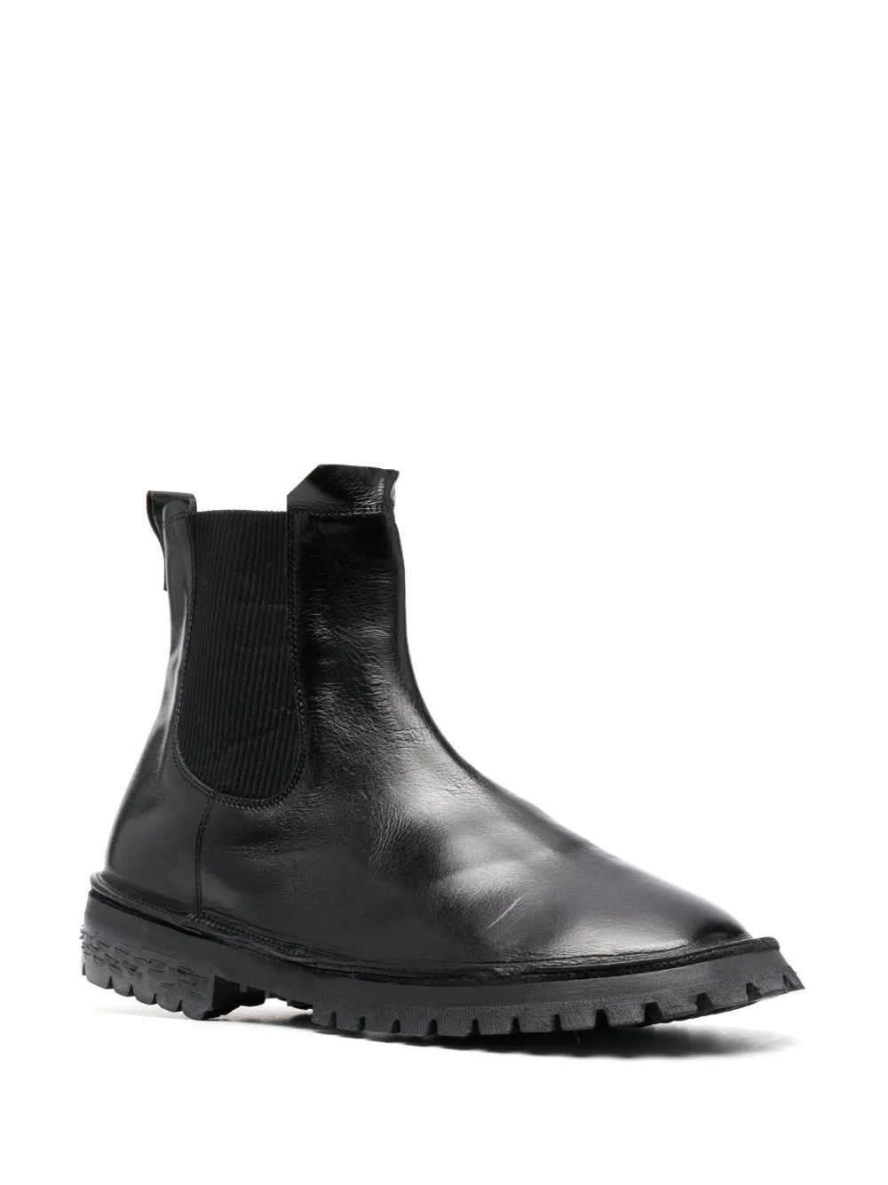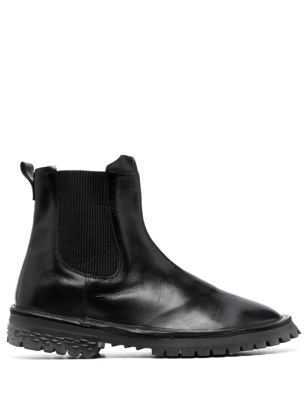 Черный, телячья кожа, гладкая текстура кожи, высота по щиколотку, эластичные боковые вставки, петля для подтягивания с логотипом, стелька с логотипом, закругленный носок, модель без застежки и рифленая резиновая подошва.