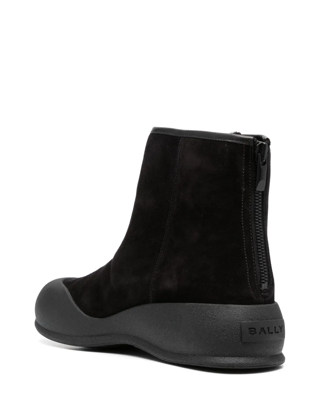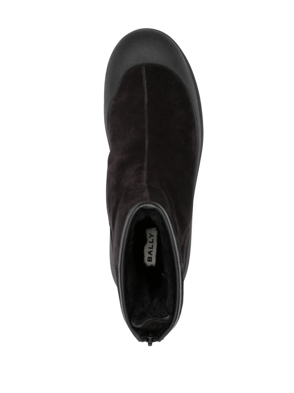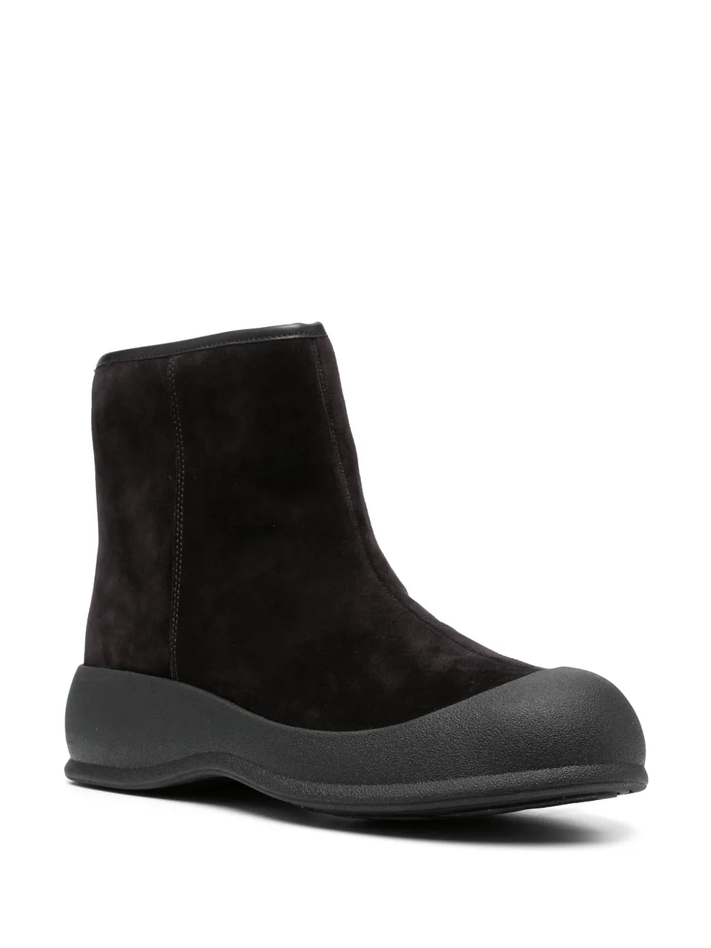 Черный, замша из телячьей кожи, овечья шерсть, логотип на подошве, миндалевидный носок, высота по щиколотку, застежка на молнии сзади, резиновый носок и плоская резиновая подошва.