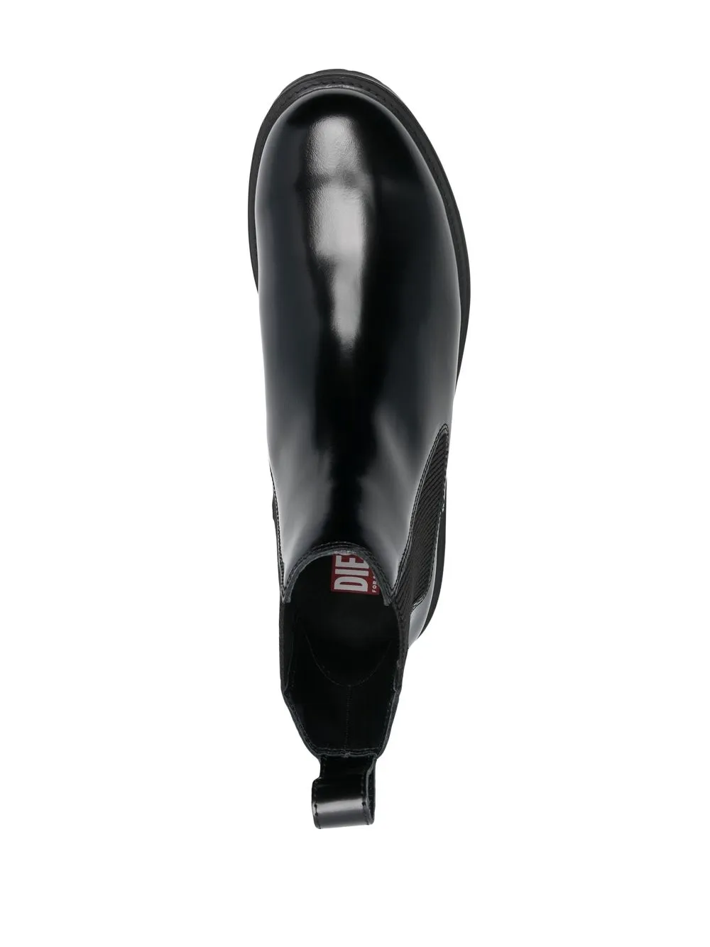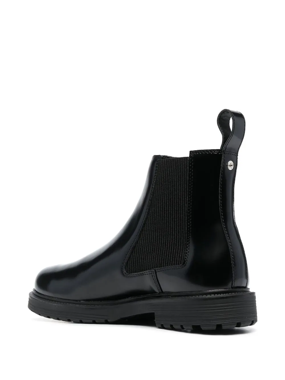 Черный, телячья кожа, лакированная кожа, логотип из заклепок, эластичные боковые вставки, закругленный носок, петля для подтягивания сзади, рифленая резиновая подошва и модель без застежки.