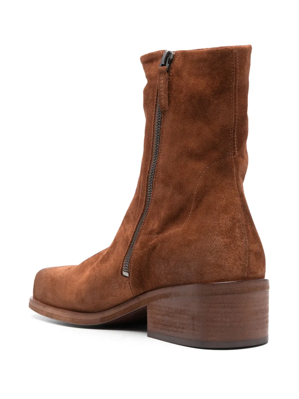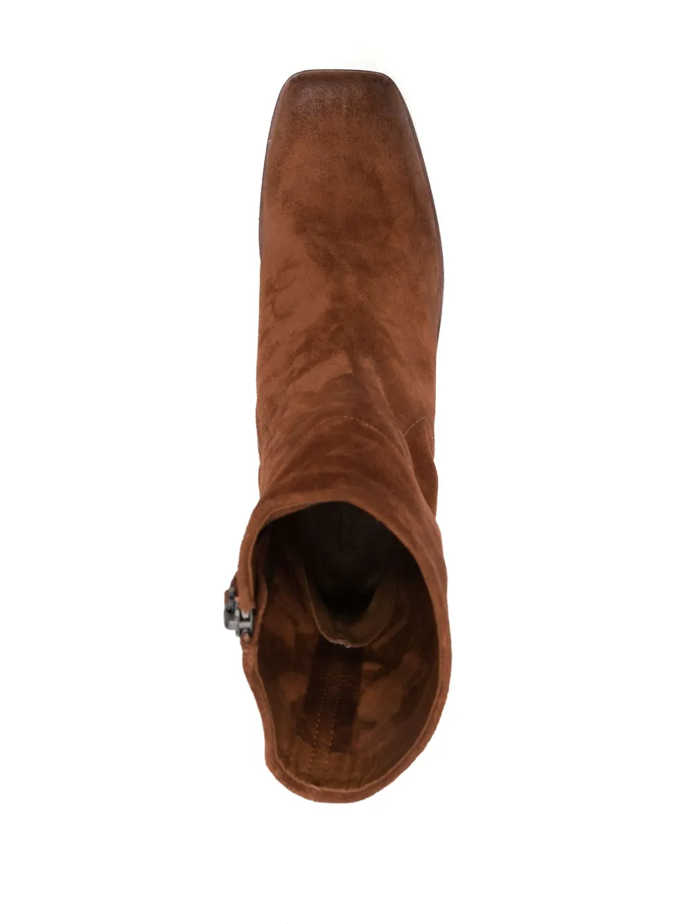Коричневый, замша из телячьей кожи, квадратный носок, высота по щиколотку, застежка на молнии сбоку и низкий блочный каблук.