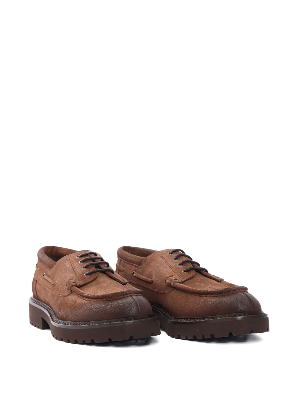 Коричневые мокасины из замшевой кожи на шнуровке с простроченным мыском, резиновой массивной подошвой
