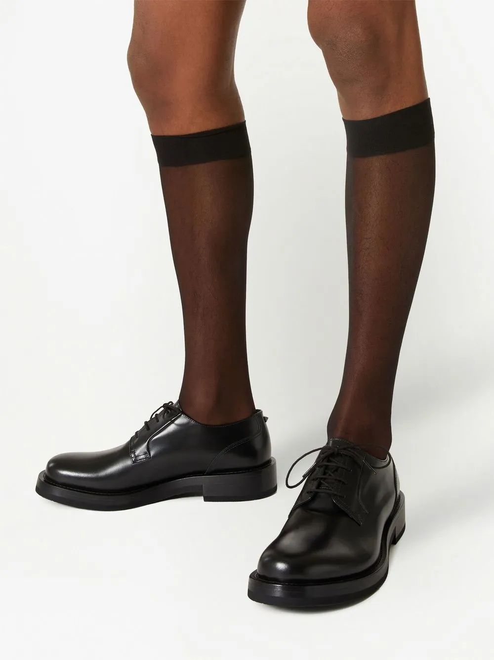 Черный, кожа, телячья кожа, глянцевая фактура, заклепки Rockstud, тисненый логотип на язычке, закругленный носок, шнуровка спереди, кожаная стелька с логотипом, низкий блочный каблук и резиновая подошва.