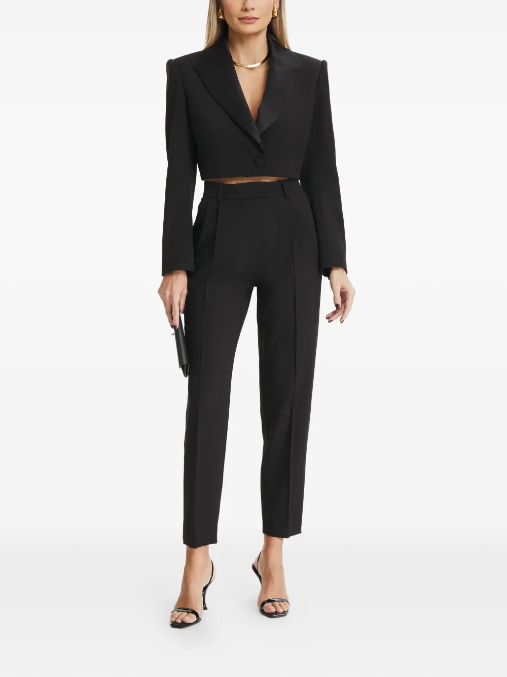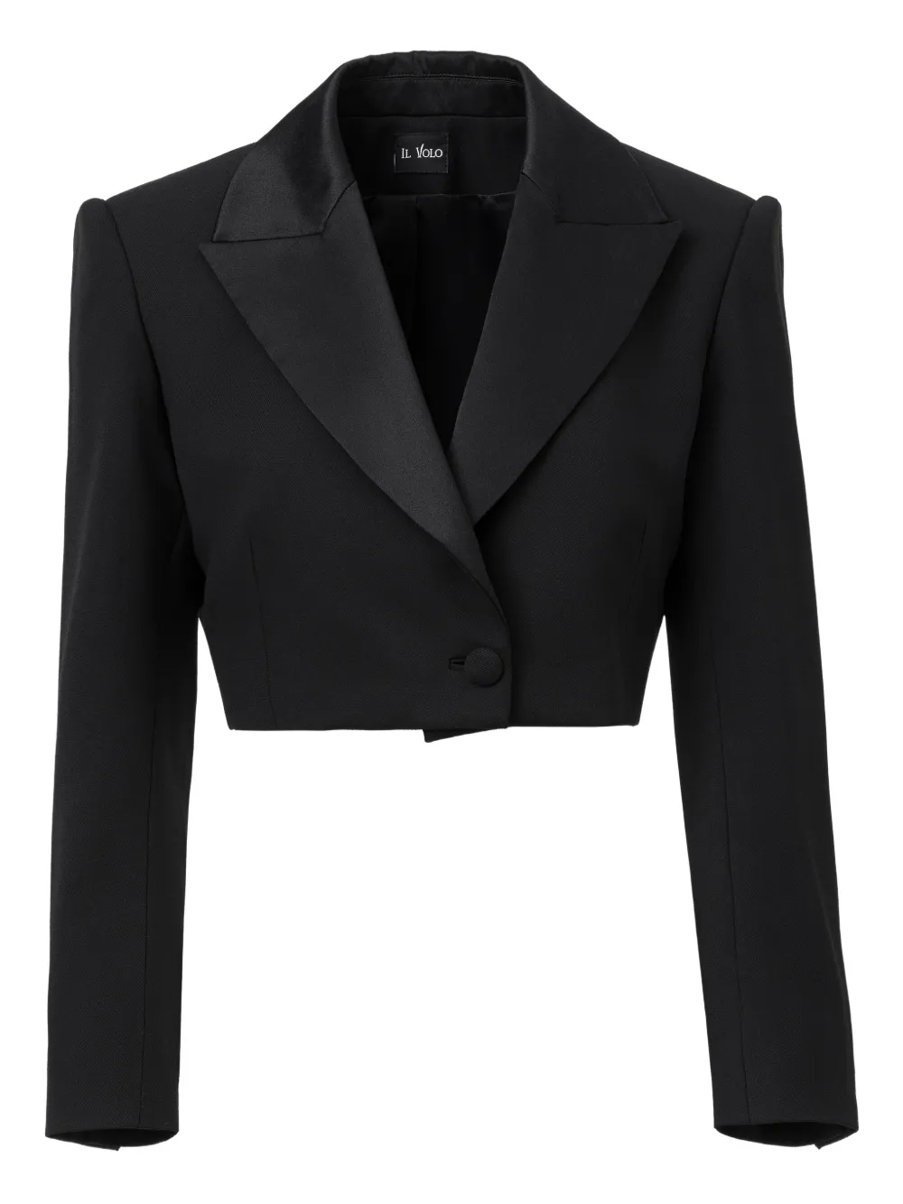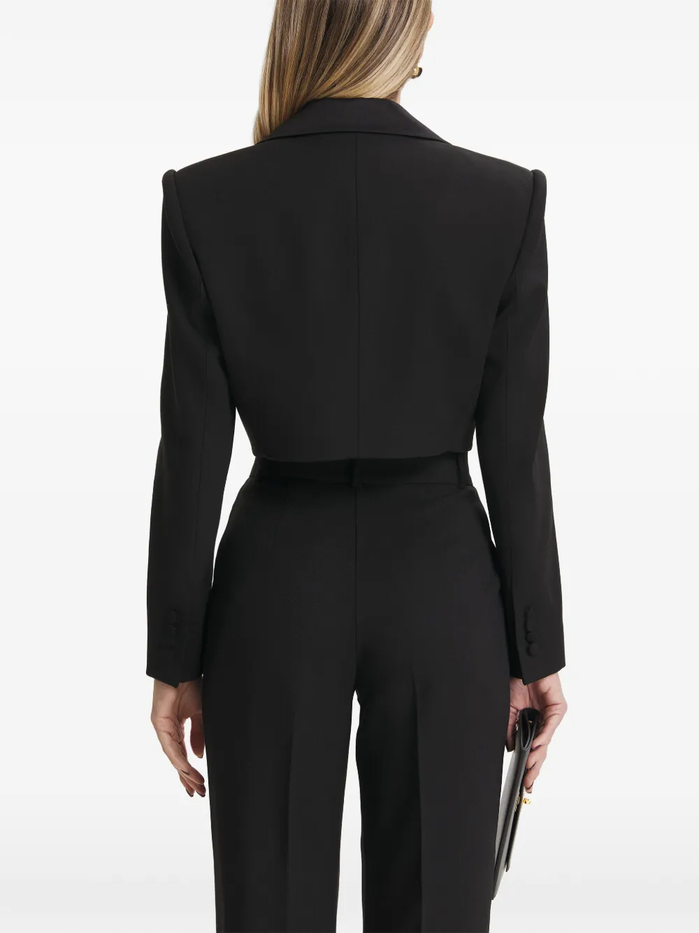 Черный укороченный жакет с застежкой на пуговицы, лацканами с острыми концами, длинными рукавами и подплечниками