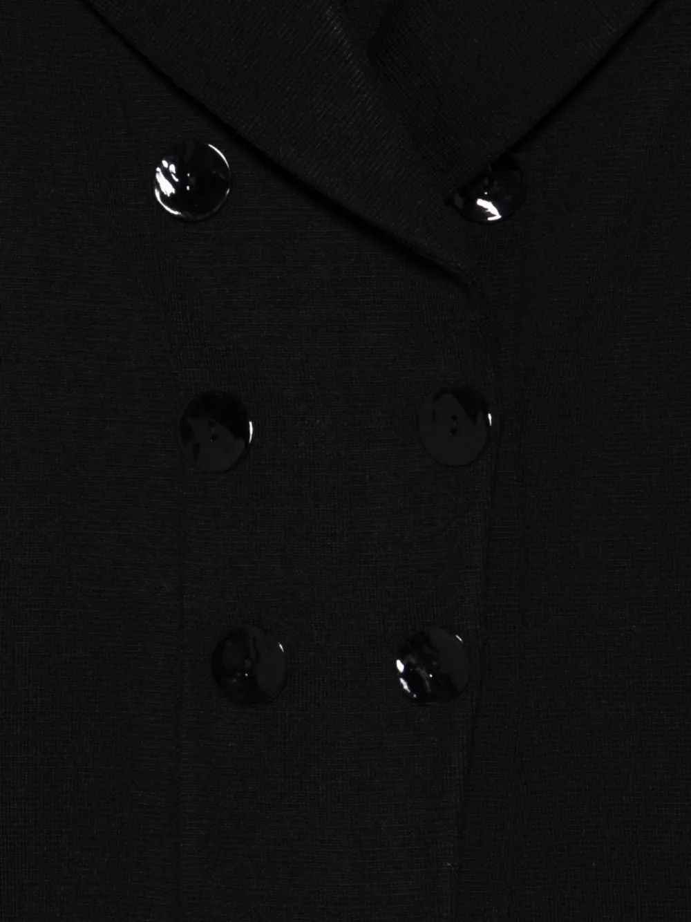 Черный двубортный пиджак с застежкой на пуговицы, лацканами с острыми отворотами и длинными рукавами