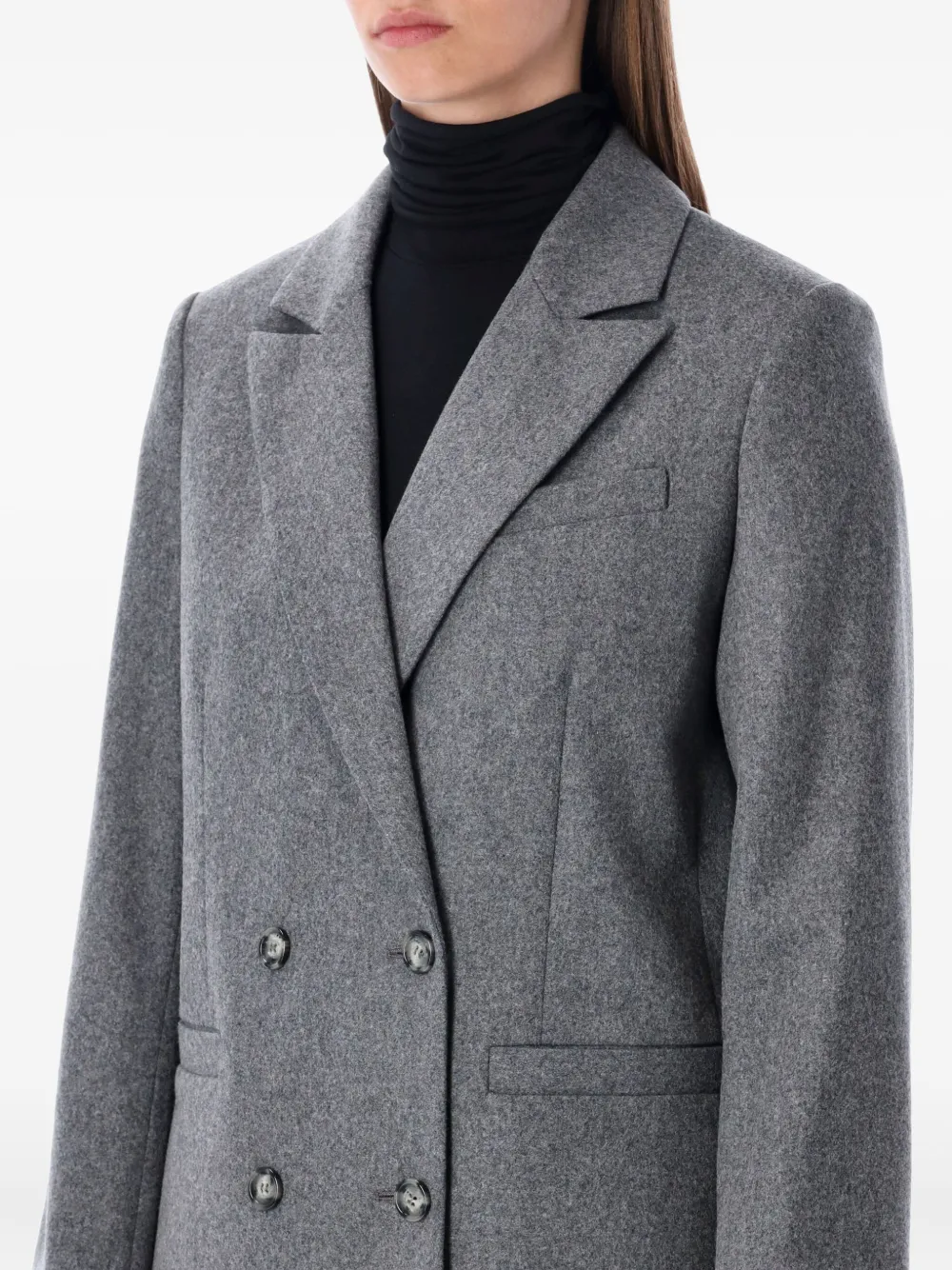 Серый двубортный жакет с застежкой на пуговицы, лацканами с острыми вырезами, клапанами на карманах и нагрудным прорезным карманом