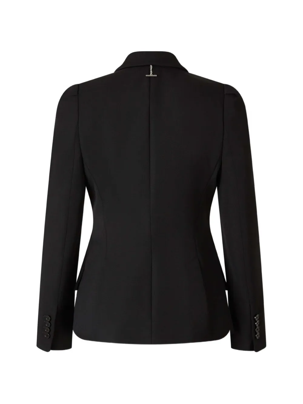 Черная однобортная куртка с пуговицами, подплечниками, лацканами с вырезом и длинными рукавами