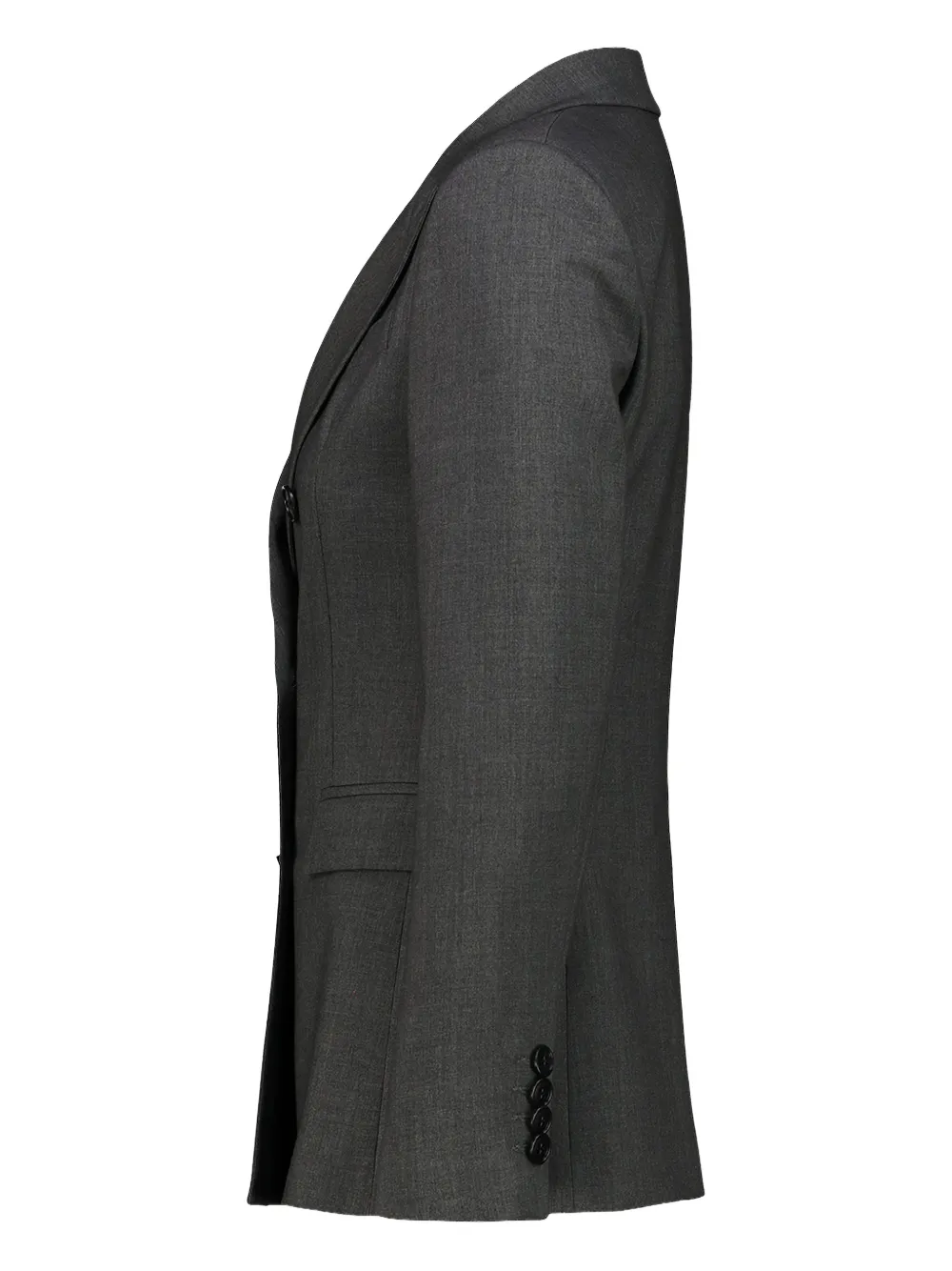 Антрацитового цвета двубортная застежка на пуговицы, клапанные карманы, манжеты на пуговицах, лацканы с острыми концами