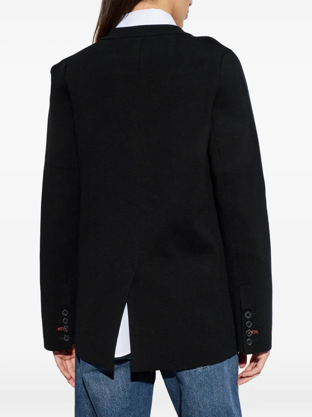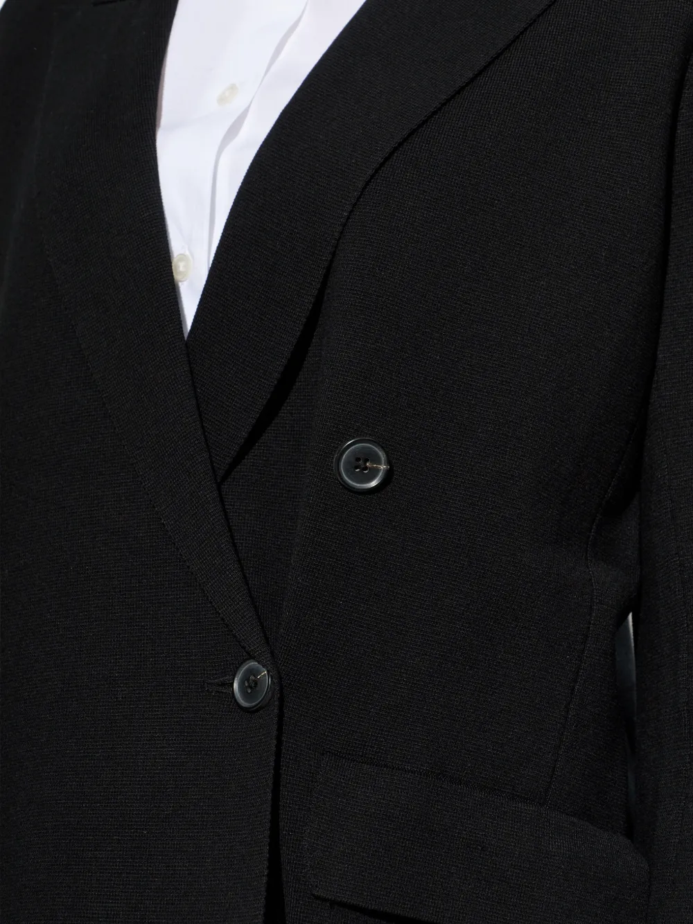 Черный двубортный пиджак с лацканами с вырезами, клапанами на карманах, застежкой на пуговицы и разрезом сзади