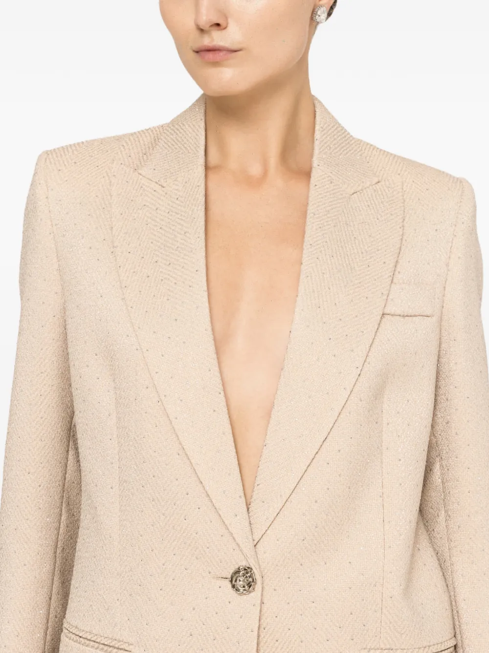 Бежевый пиджак с украшением стразами, застежкой на пуговицы спереди, лацканами с вырезом и клапанными карманами
