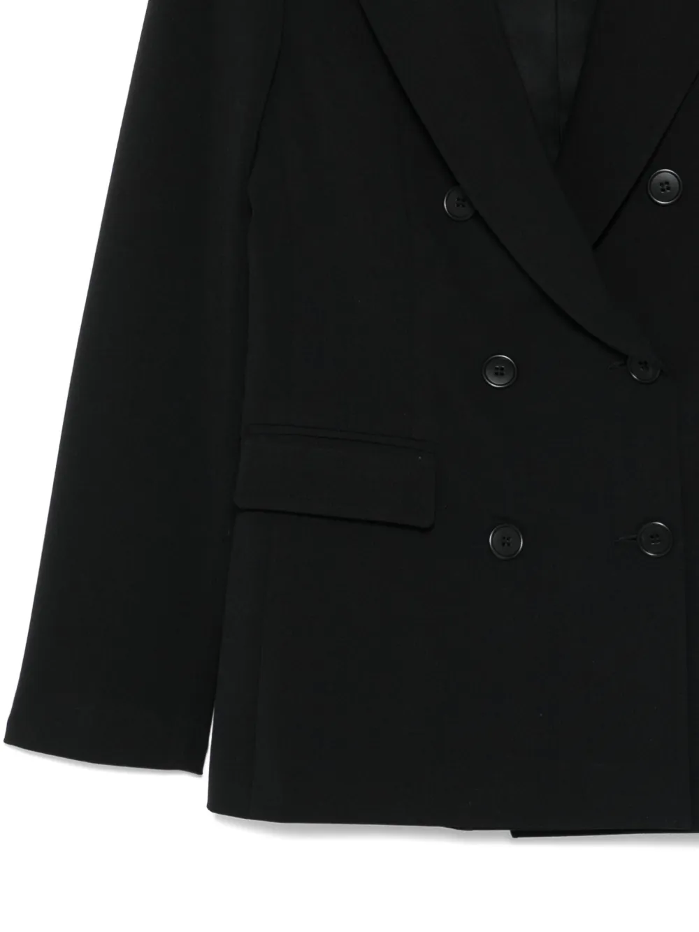 Черные заостренные лацканы, застежки на пуговицах на манжетах, карманы с клапанами