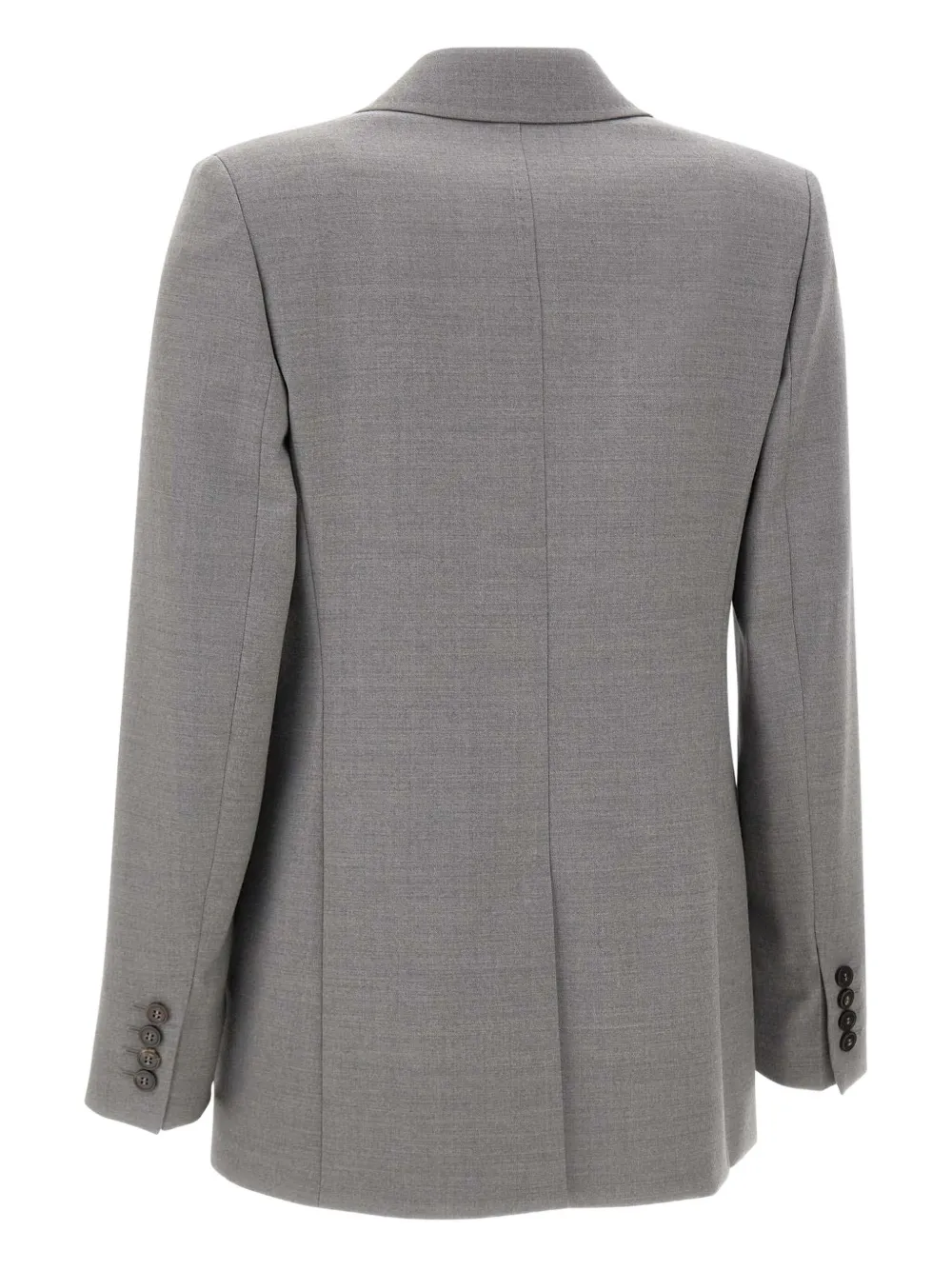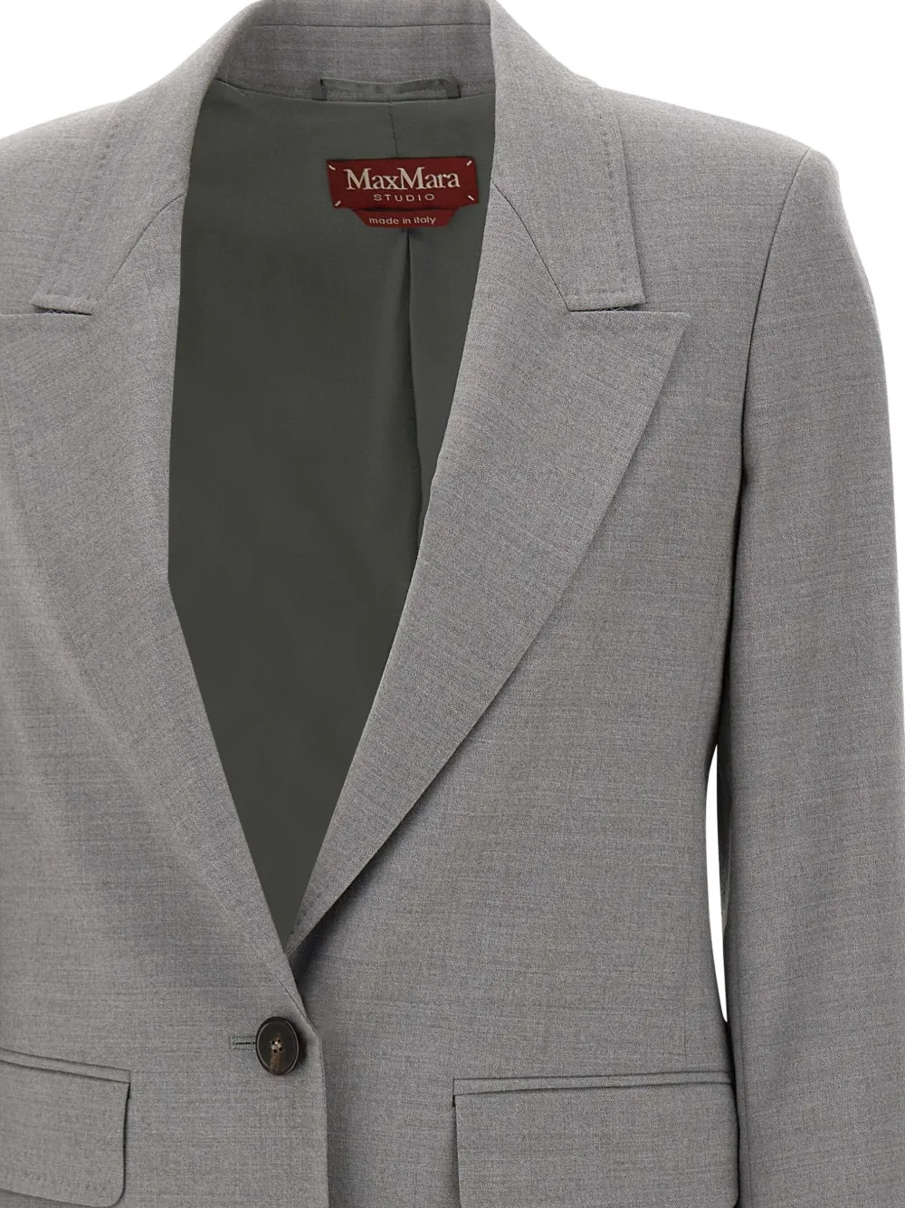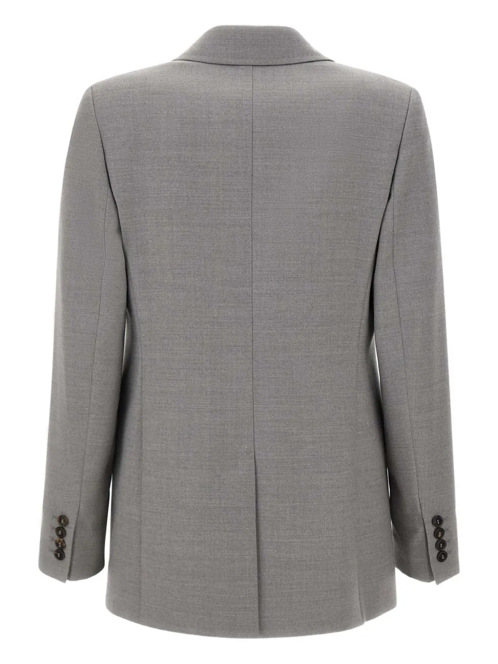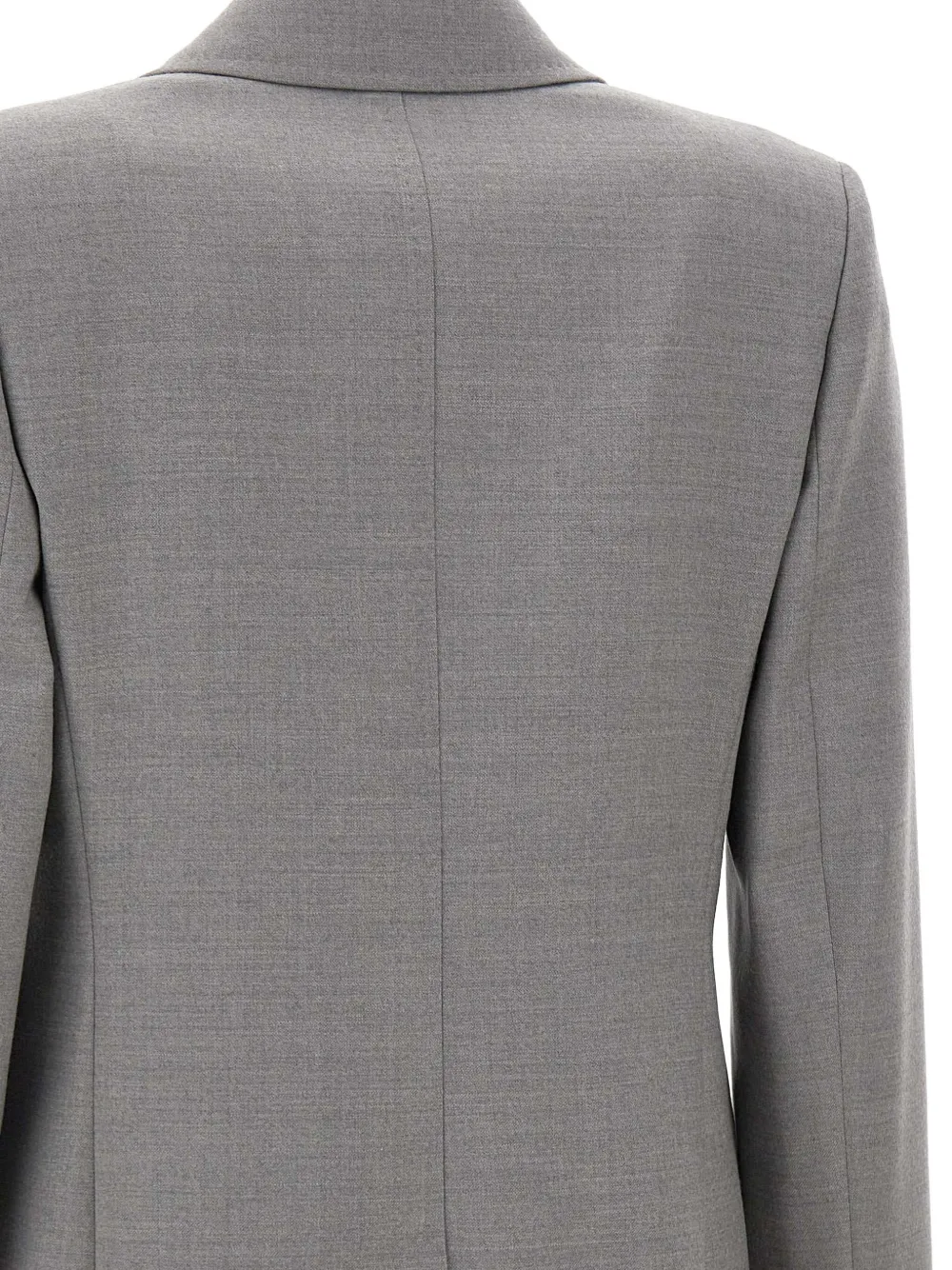 Серые острые лацканы, однобортная застежка на одну пуговицу, боковые карманы с клапанами, рукава на пуговицах, центральная задняя шлица