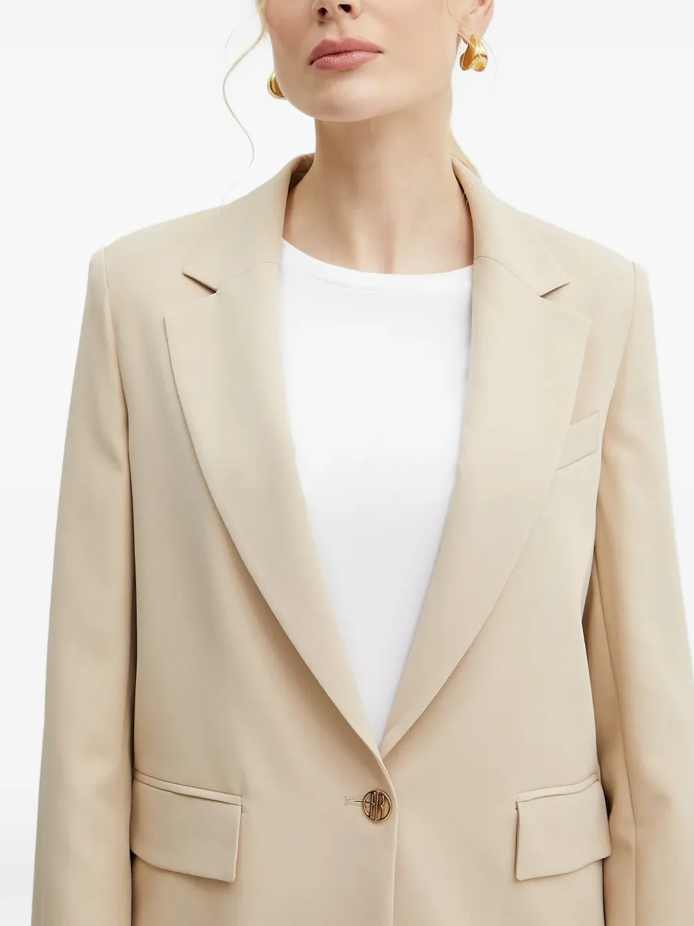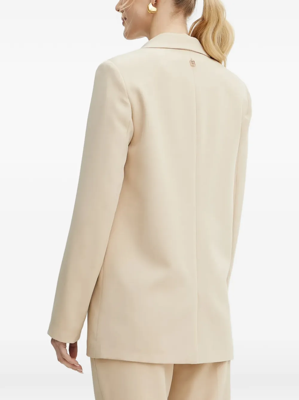 Нейтральные лацканы с выемкой, застежка на одну пуговицу, передние клапанные карманы, подвеска сзади