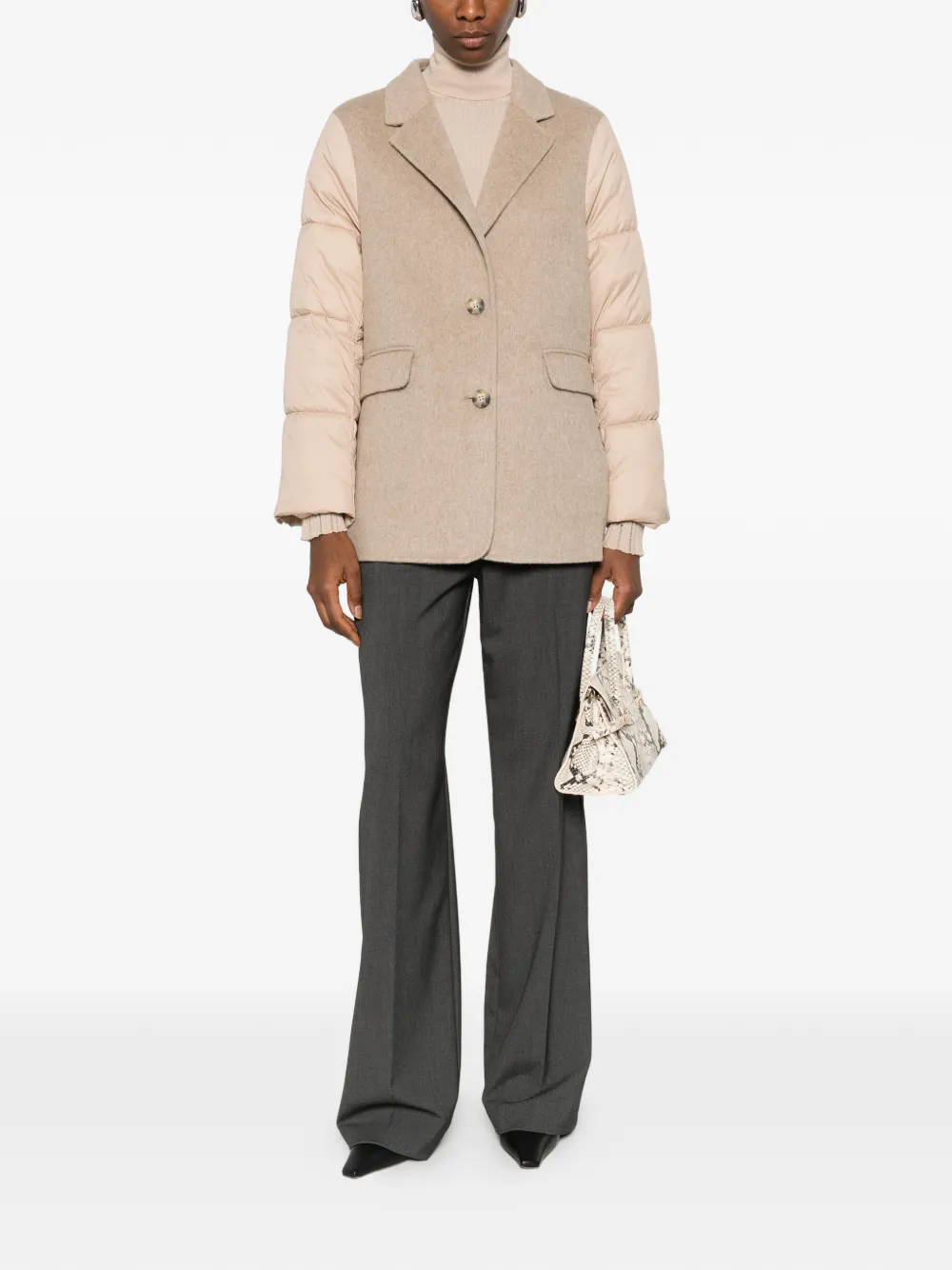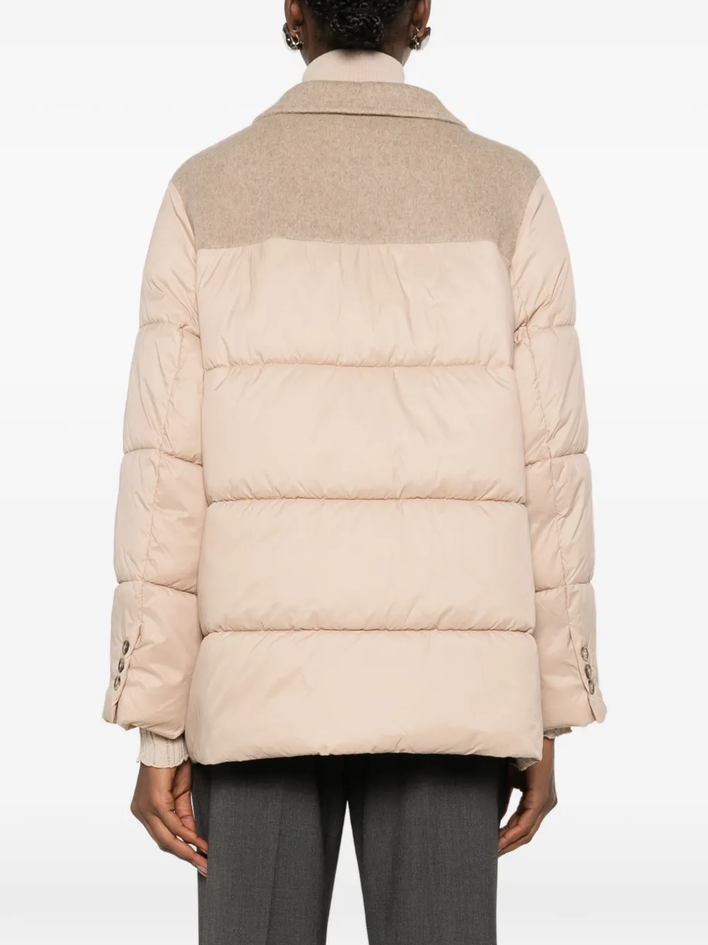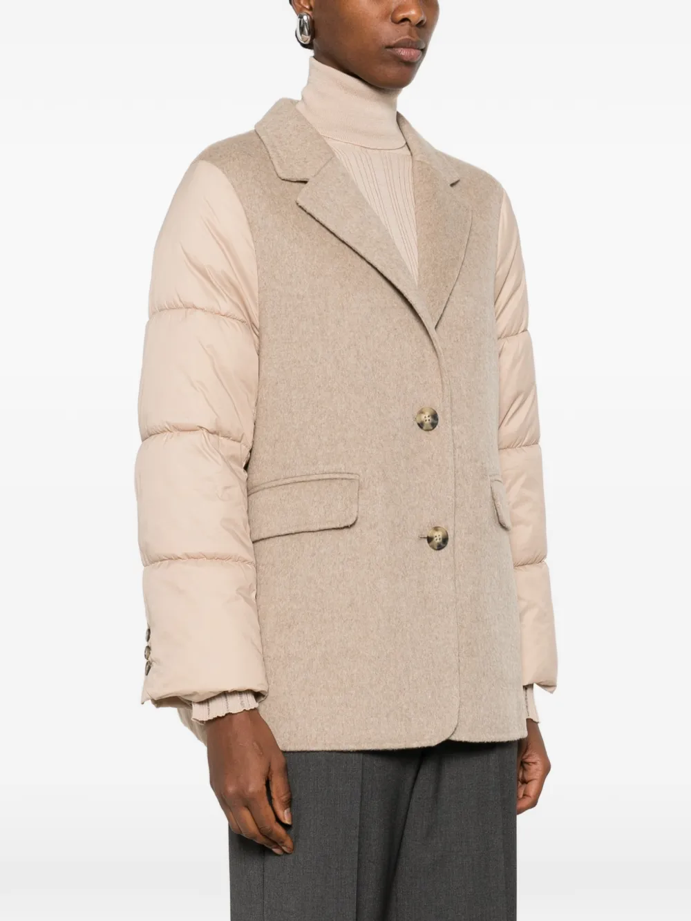Бежевые стеганые рукава, застежка на пуговицы спереди, накладные карманы, V-образный вырез, длинные рукава