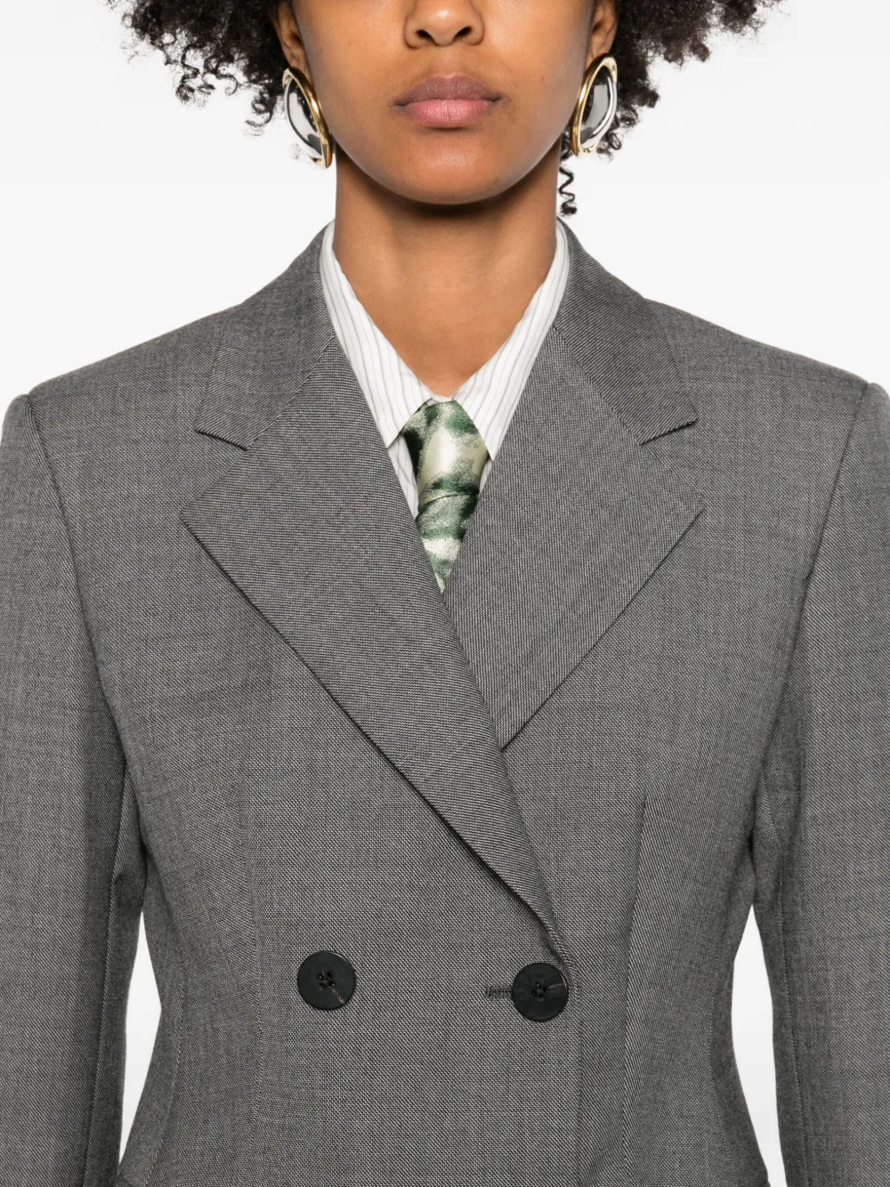 Серый цвет, двубортная застежка, лацканы с вырезом, прорезные карманы, длинные рукава, прямой подол