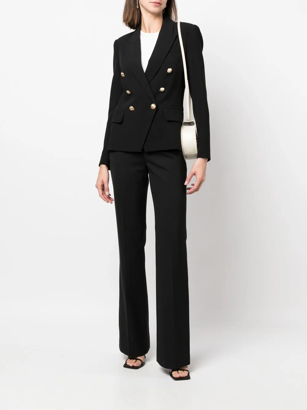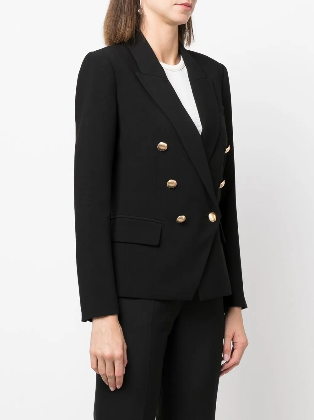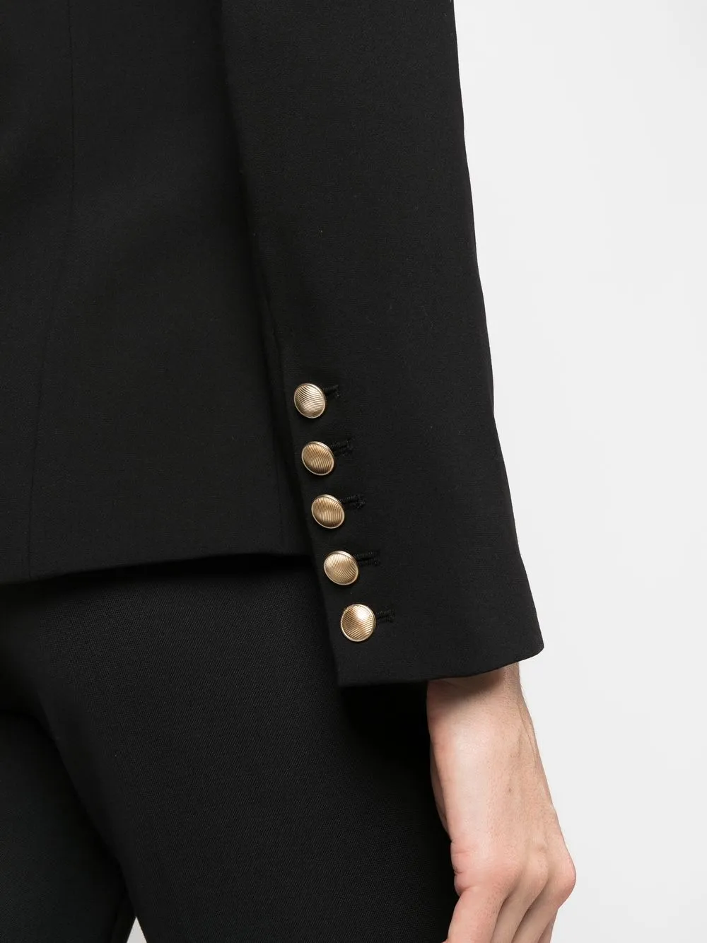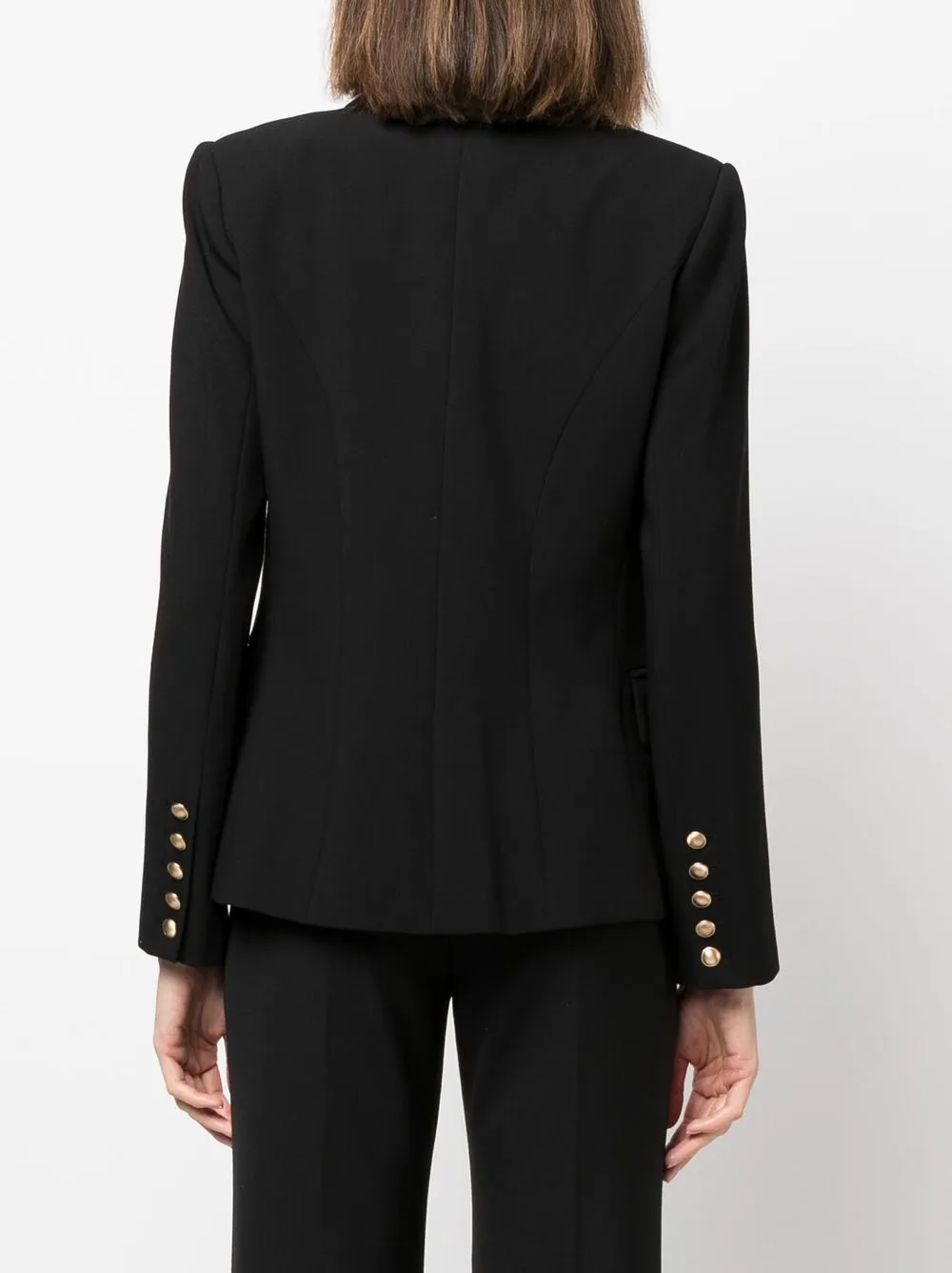 Черный, двубортная застежка на кнопки, золотистые пуговицы, заостренные лацканы, длинные рукава, манжеты на пуговицах, прорезной карман на груди, два передних кармана с клапанами, подплечники, приталенный силуэт, прямой подол и цельная подкладка.