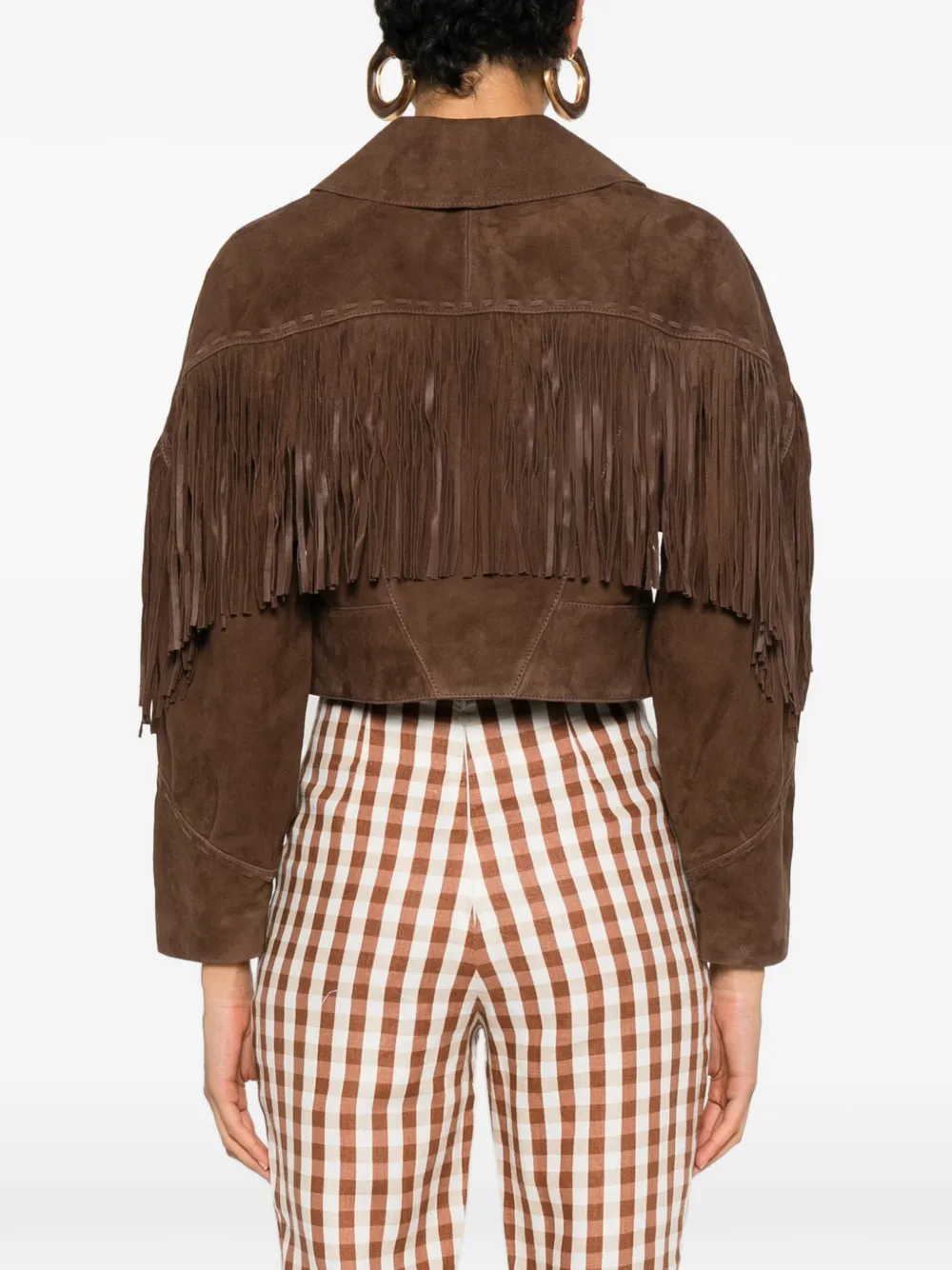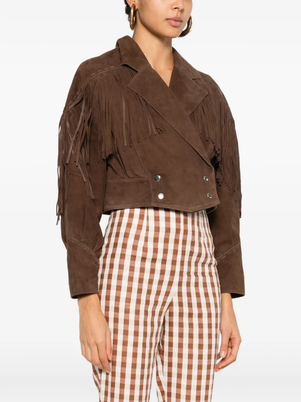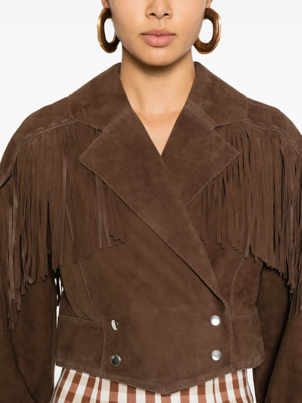 Коричневый кроп-жакет с лацканами, серебристыми пуговицами, бахромой спереди и двубортной застежкой