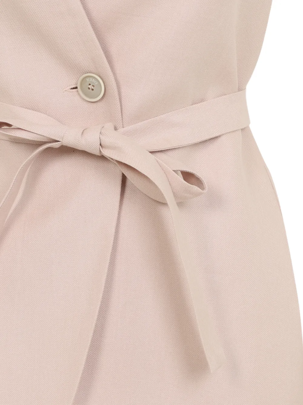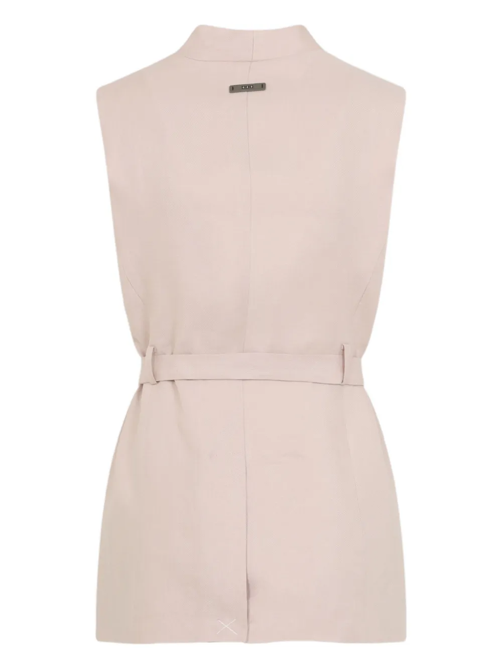 Бежевый жилет без рукавов с поясом, стойкой, запахом и пуговицами спереди