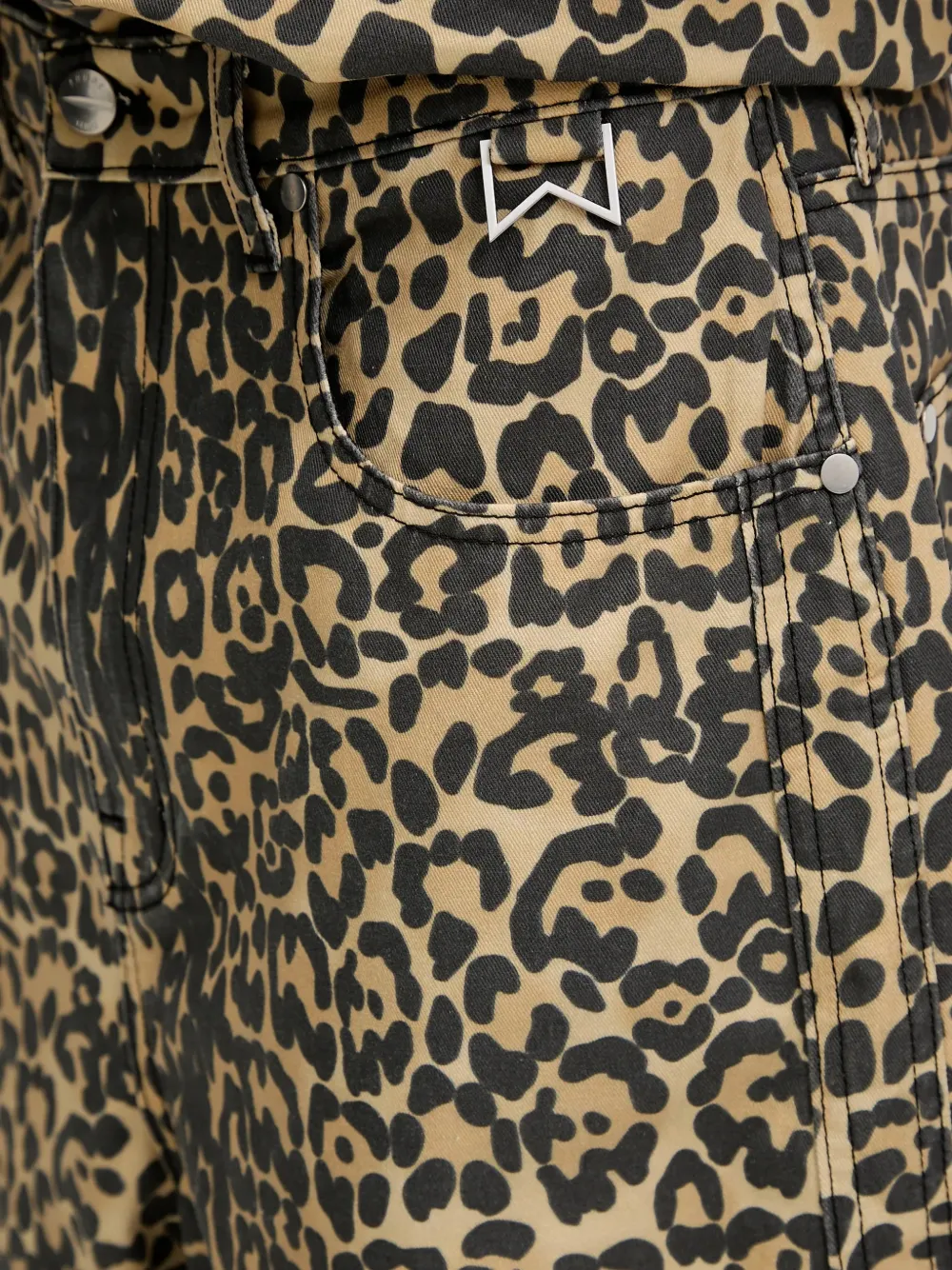 Коричневый леопардовый принт по всей поверхности, фурнитура с логотипом, пять карманов, шлевки для ремня, металлические заклепки