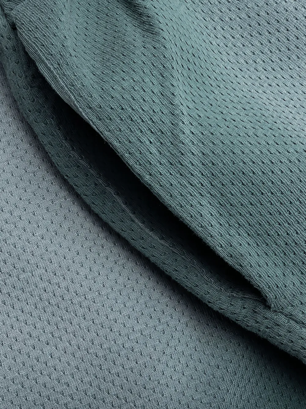 Зеленая сетчатая текстура, надпись, задний накладной карман, боковые карманы в шве, эластичный пояс