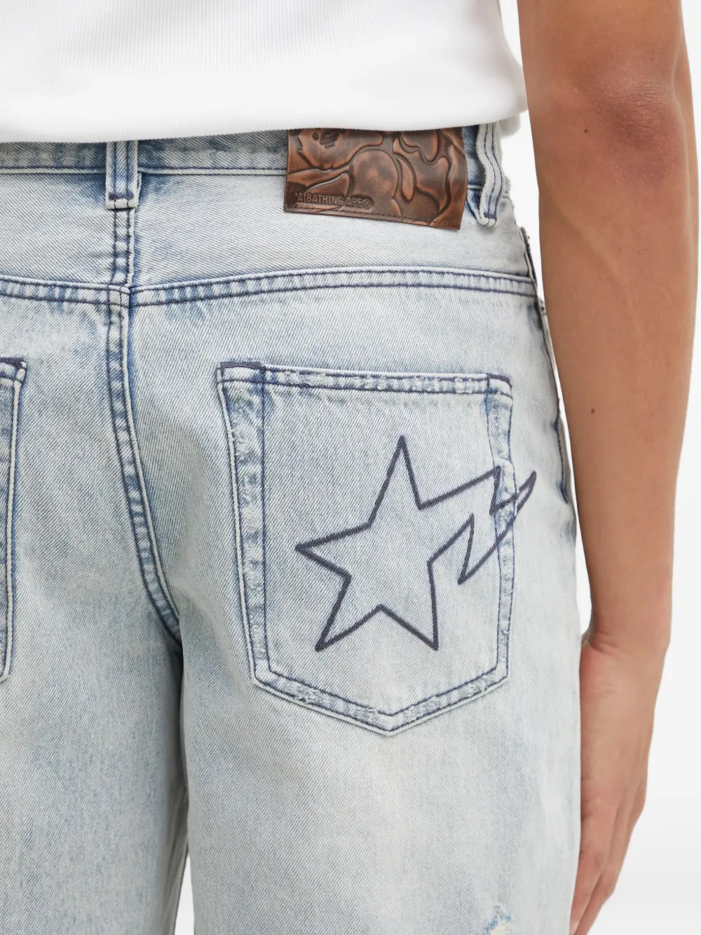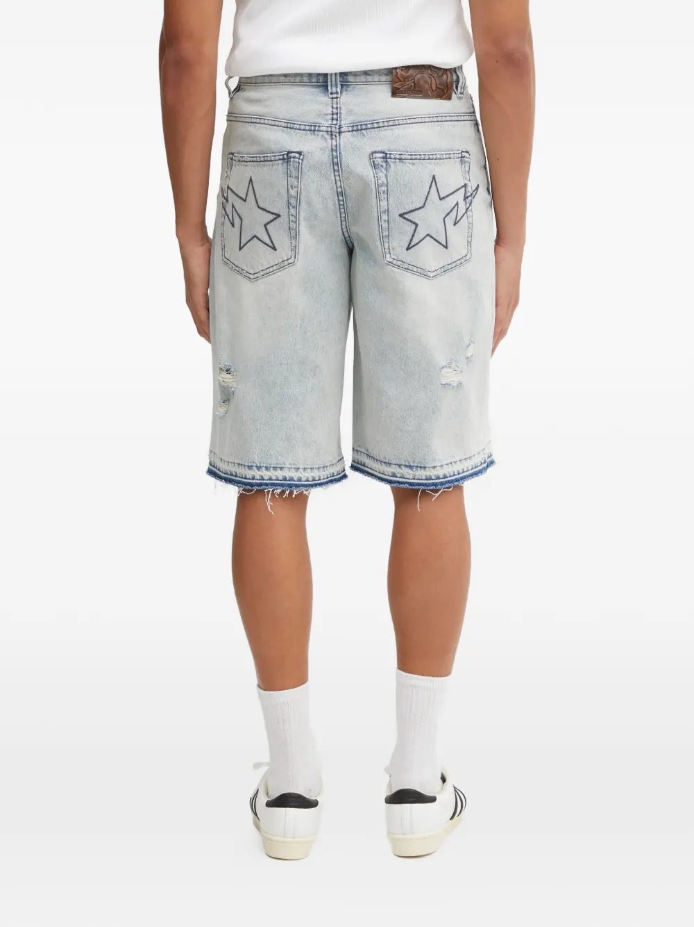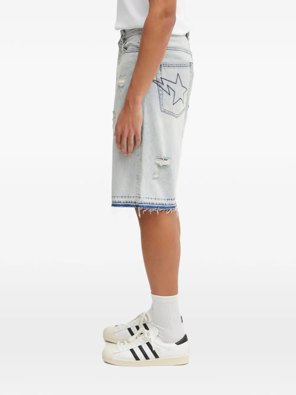 Светло-индиго голубой, детали в виде звезд, необработанный край, эффект потертости, пять карманов, застежка на пуговицы