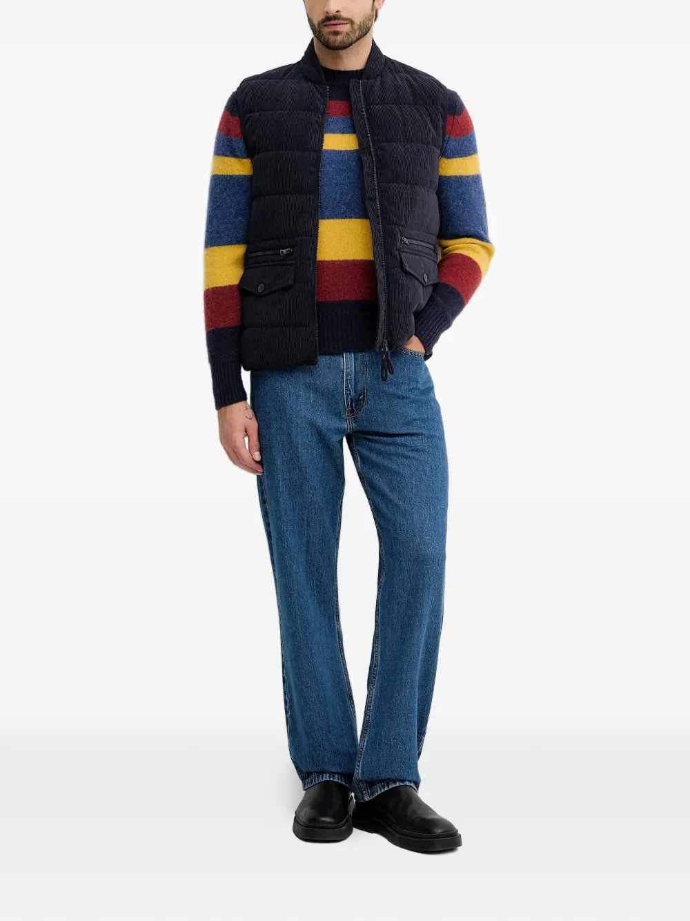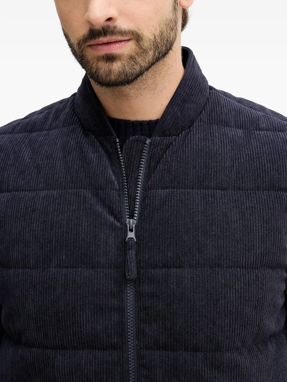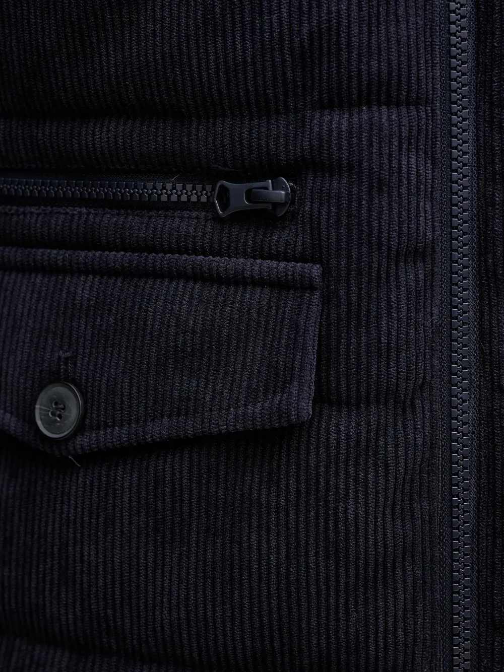 Темно-синий вельвет, текстура, застежка-молния, нагрудные карманы, пуговицы, стеганый