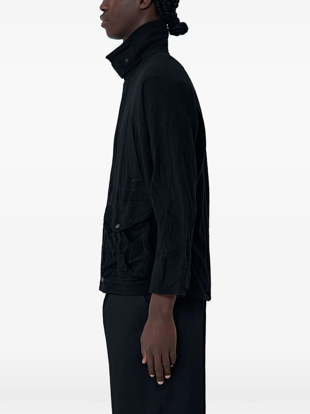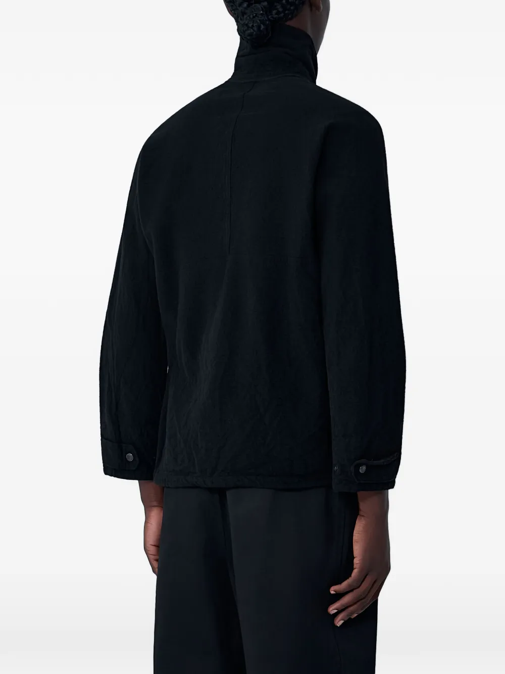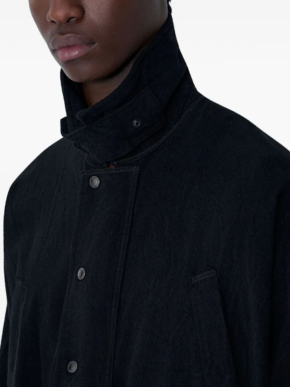 Черный цвет, стойка-воротник, застежка на кнопки, длинные рукава, накладные карманы спереди