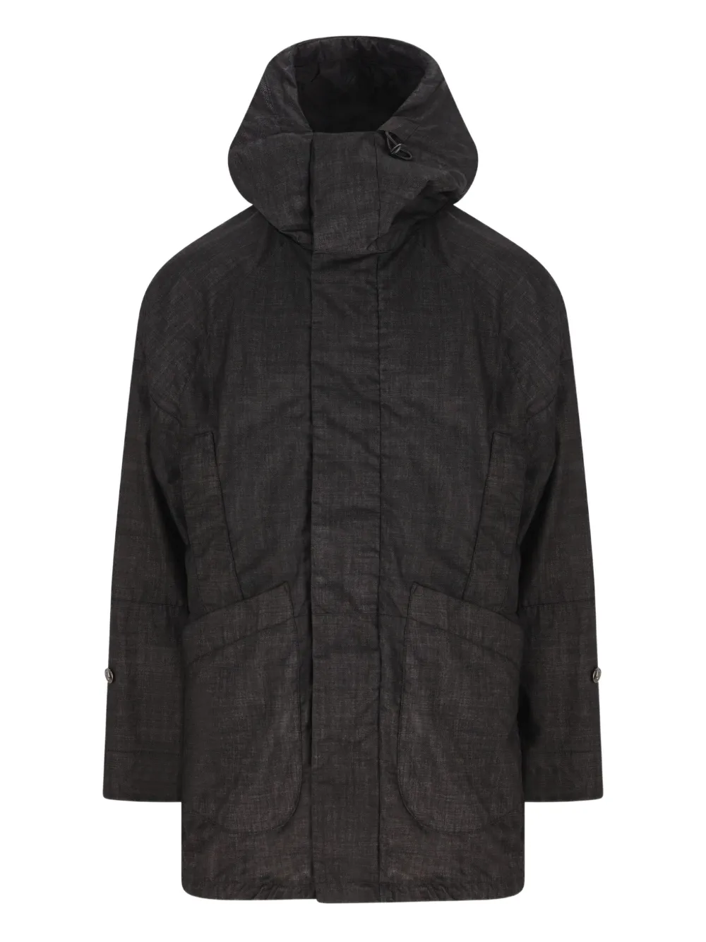 Черный фактурное плетение скрытая застежка спереди два накладных кармана капюшон манжеты на пуговицах