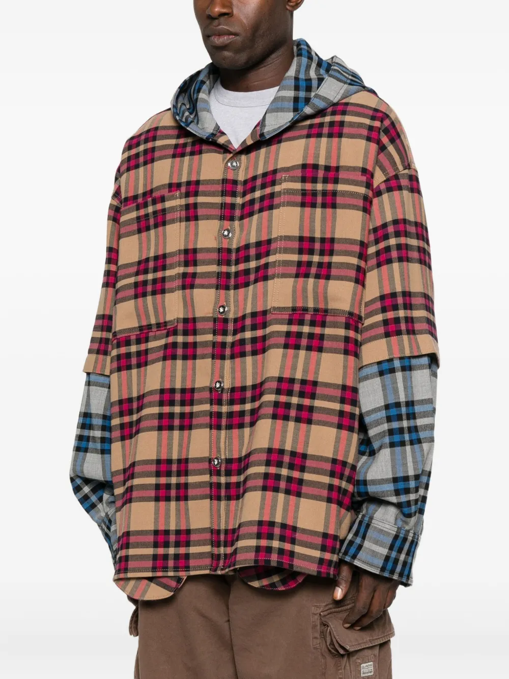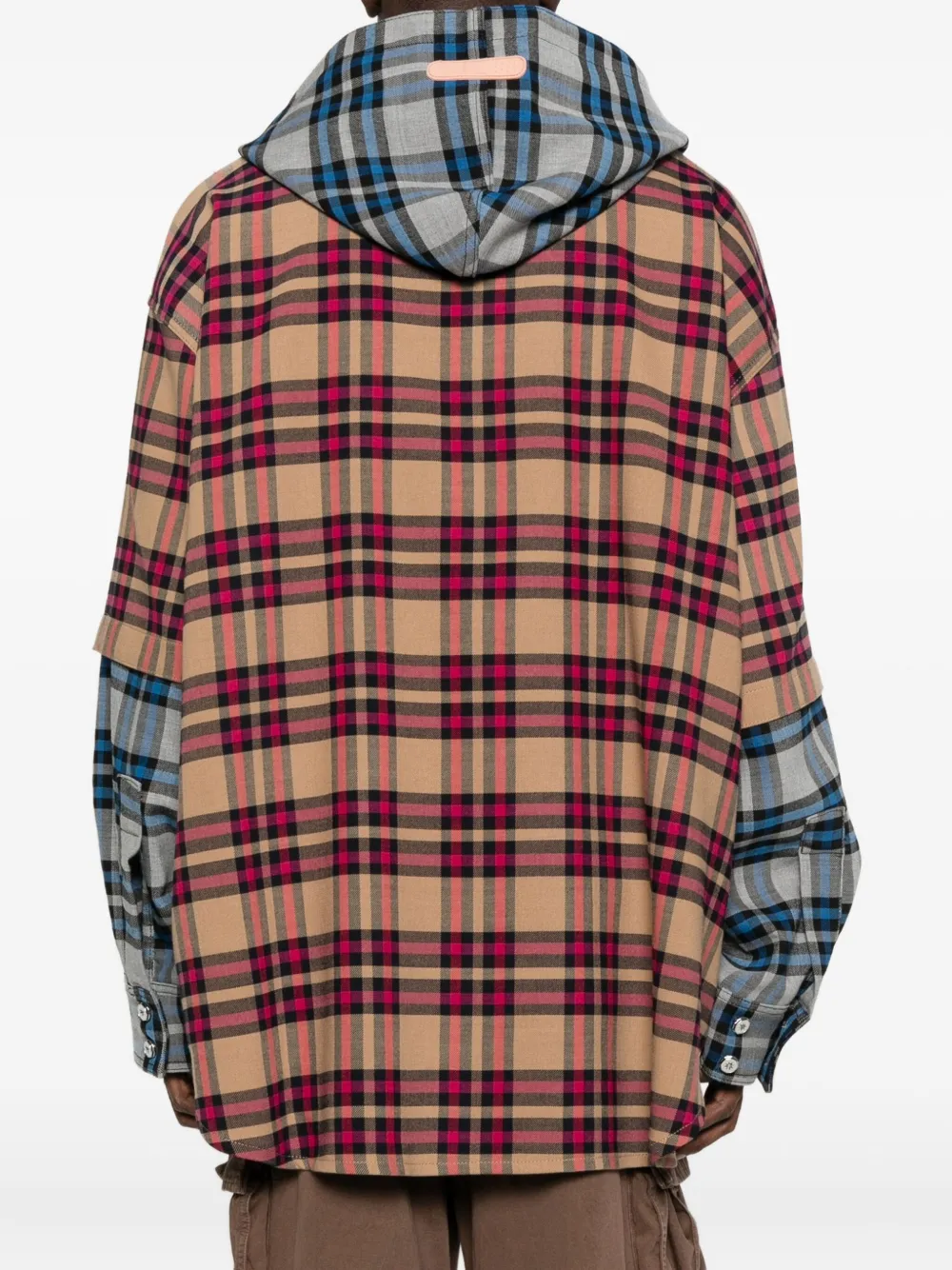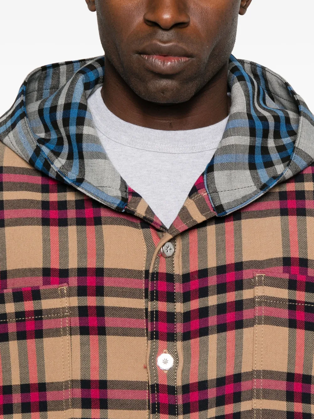 Коричневая и красная классическая куртка в клетку, застежка на пуговицы, длинные рукава, рукава контрастного цвета