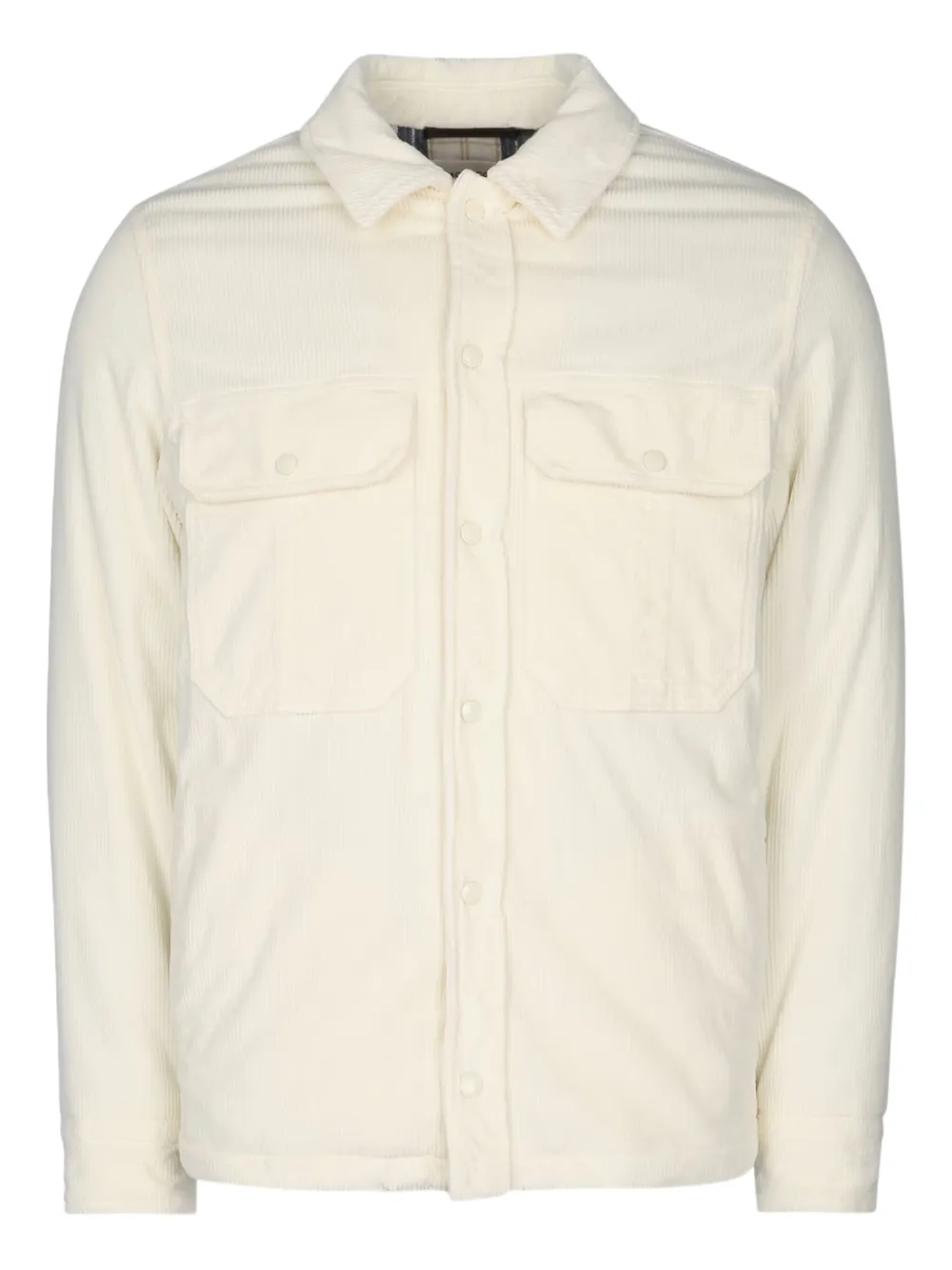 Кремово-белый вельвет, текстурированный, застежка на пуговицы, нагрудные карманы с клапанами, длинные рукава, манжеты на пуговицах