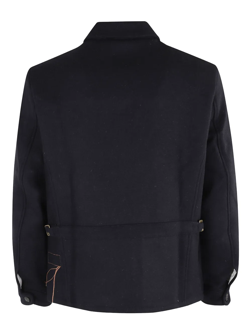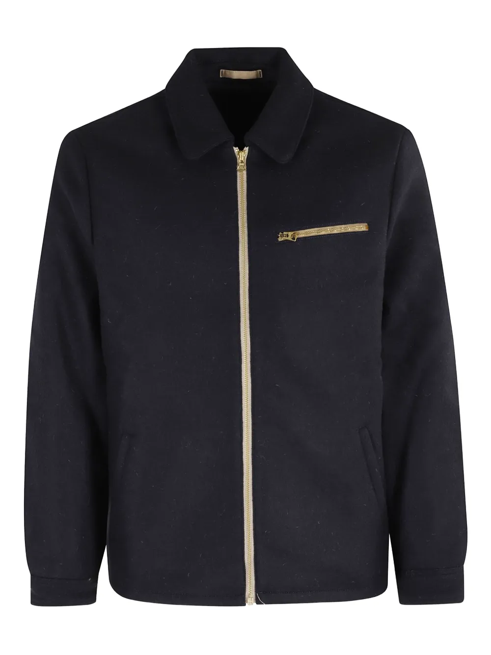 Синяя куртка с застежкой-молнией спереди, отложным воротником, боковыми прорезными карманами, пряжкой и длинными рукавами