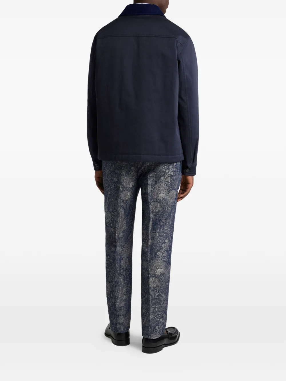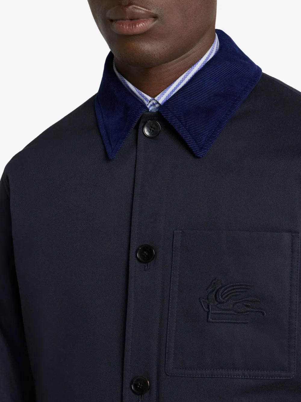 Синий вельветовый воротник, застежка на пуговицы, накладной карман на груди, прорезные карманы с клапанами