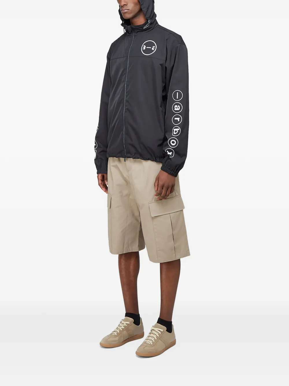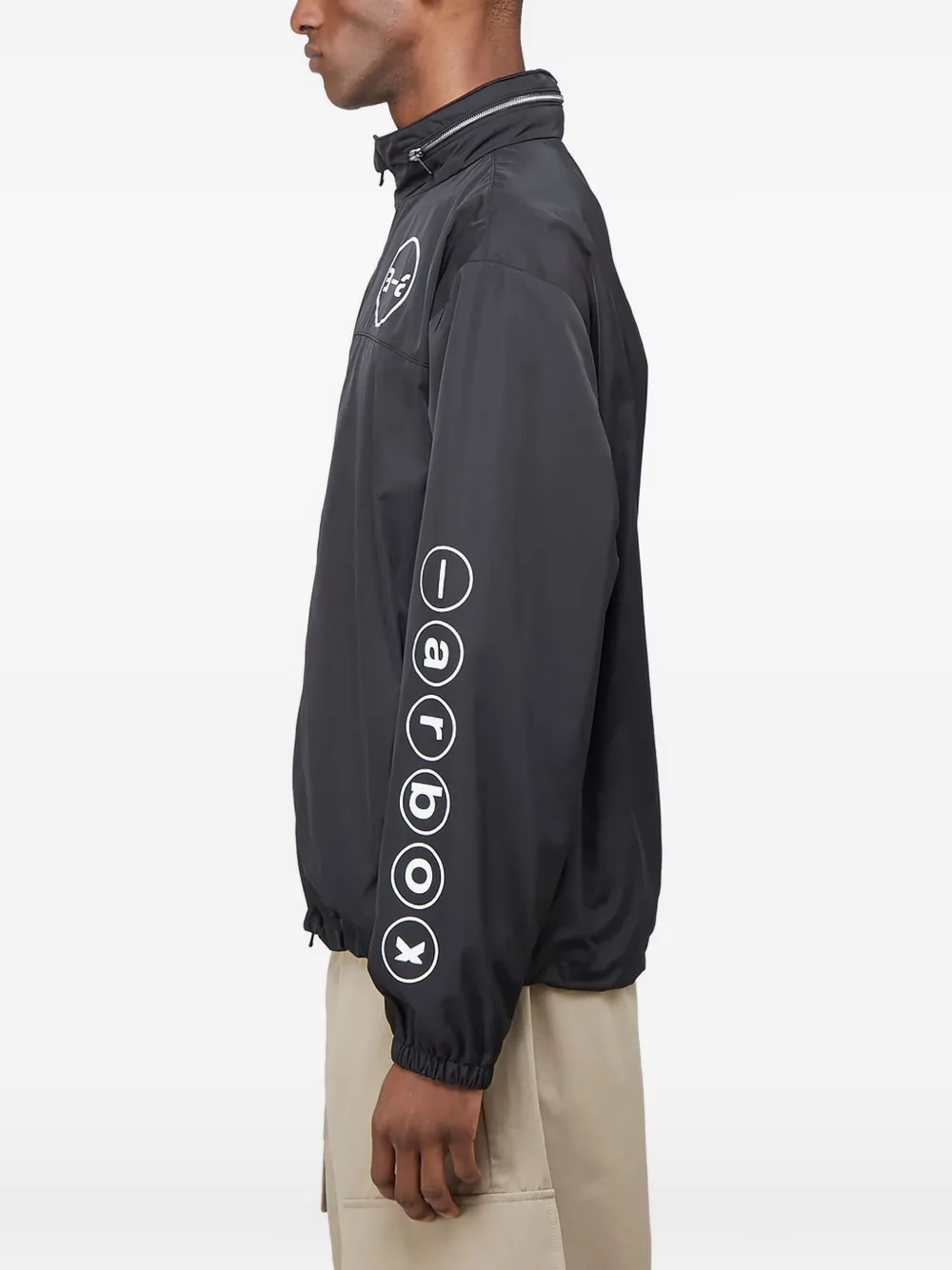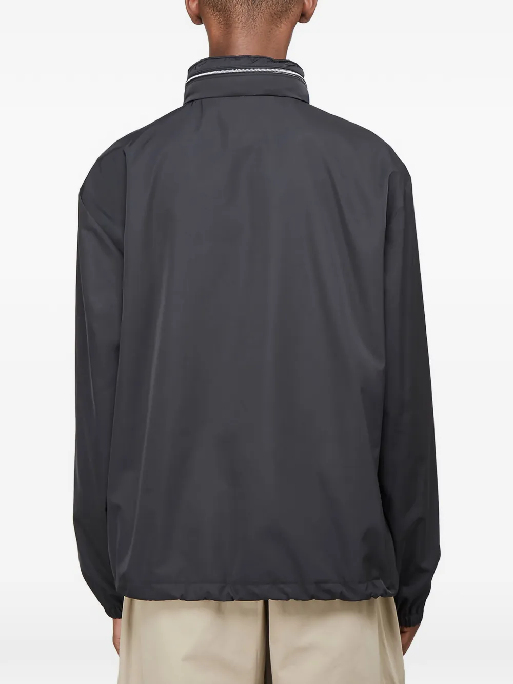 Темно-серый цвет, логотип на груди, стойка-воротник, эластичные манжеты, боковые прорезные карманы