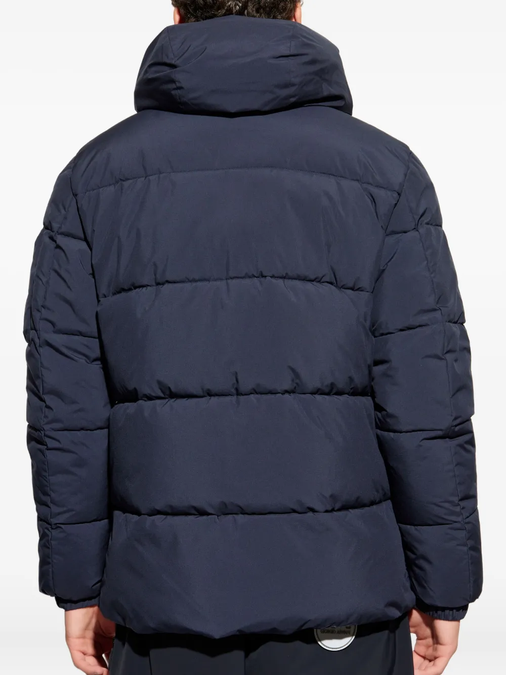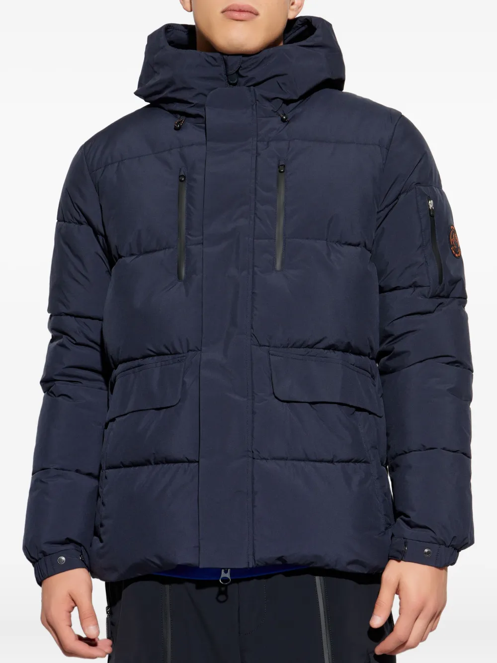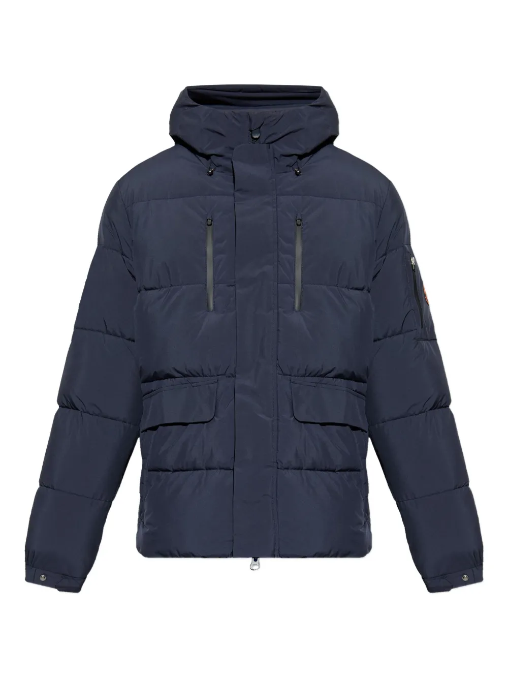 Темно-синяя стеганая куртка с капюшоном, молниями на карманах, длинными рукавами и фронтальными карманами