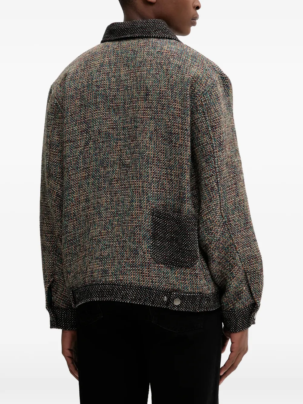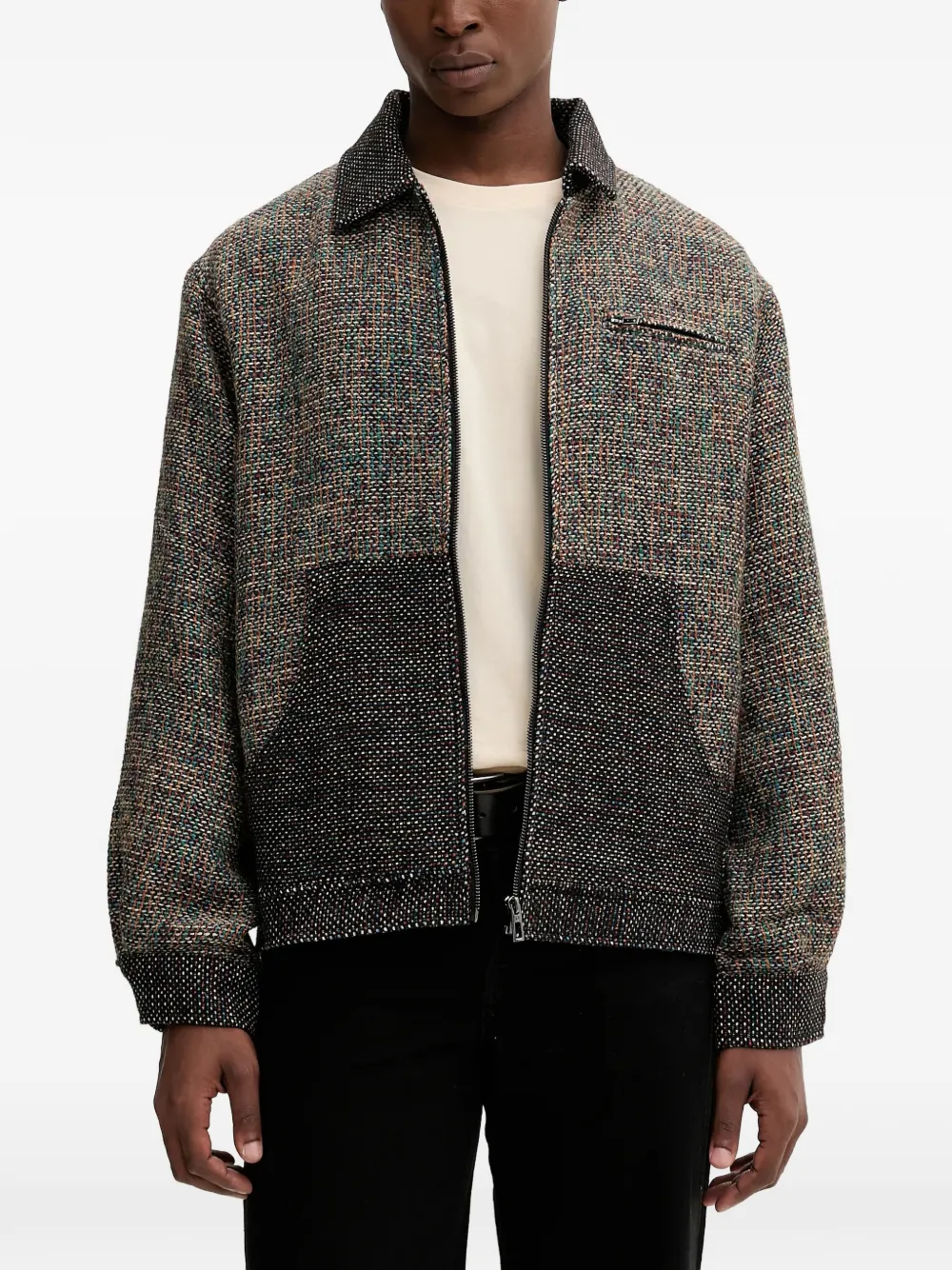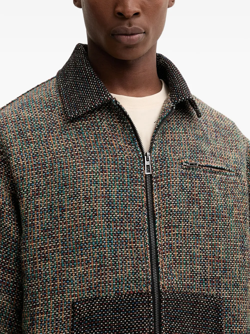 Коричневый/многоцветный, фактурный, с отложным воротником, застежка-молния, прорезной карман на груди, манжеты на пуговицах