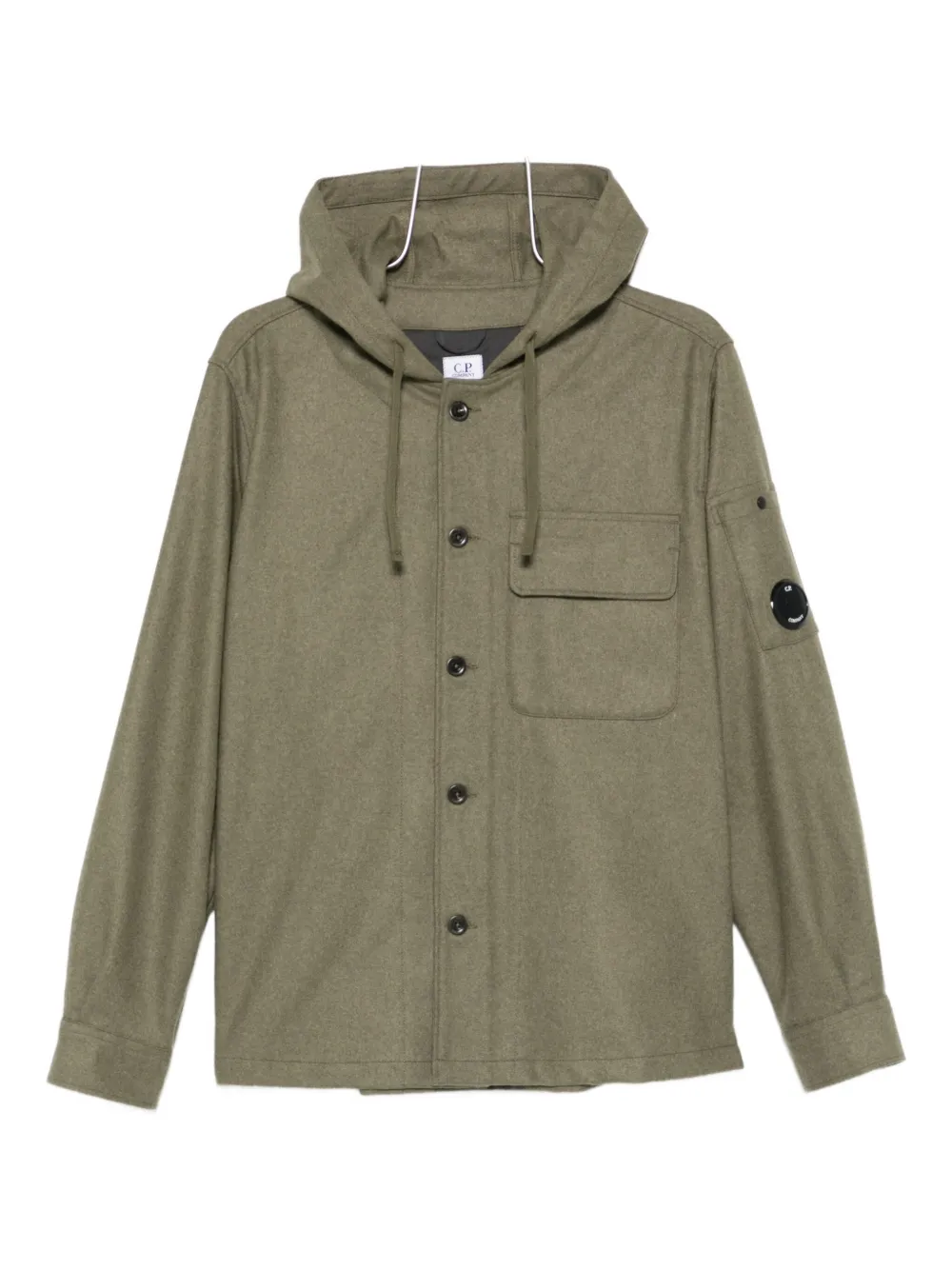 Оливково-зеленый худи, застежка на пуговицы, накладные карманы, длинные рукава, фирменная линза. C.P. Company рекомендует снимать все съемные аксессуары перед стиркой.