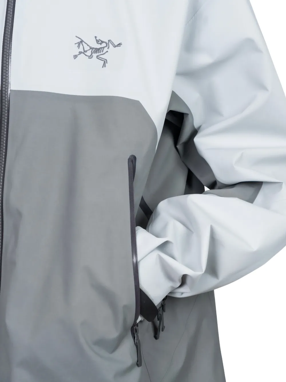 Светло-серый цвет, застежка-молния, классический капюшон, передние карманы на молнии, эластичные манжеты