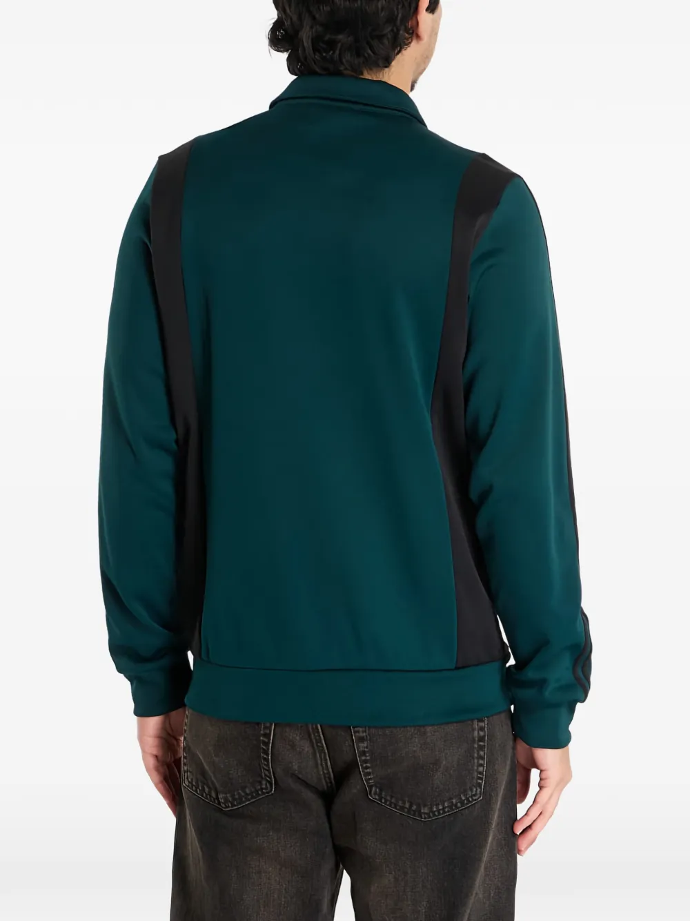 Зеленый цвет, боковые прорезные карманы, застежка-молния спереди, отделка в виде трех полос, воротник с острыми концами, длинные рукава