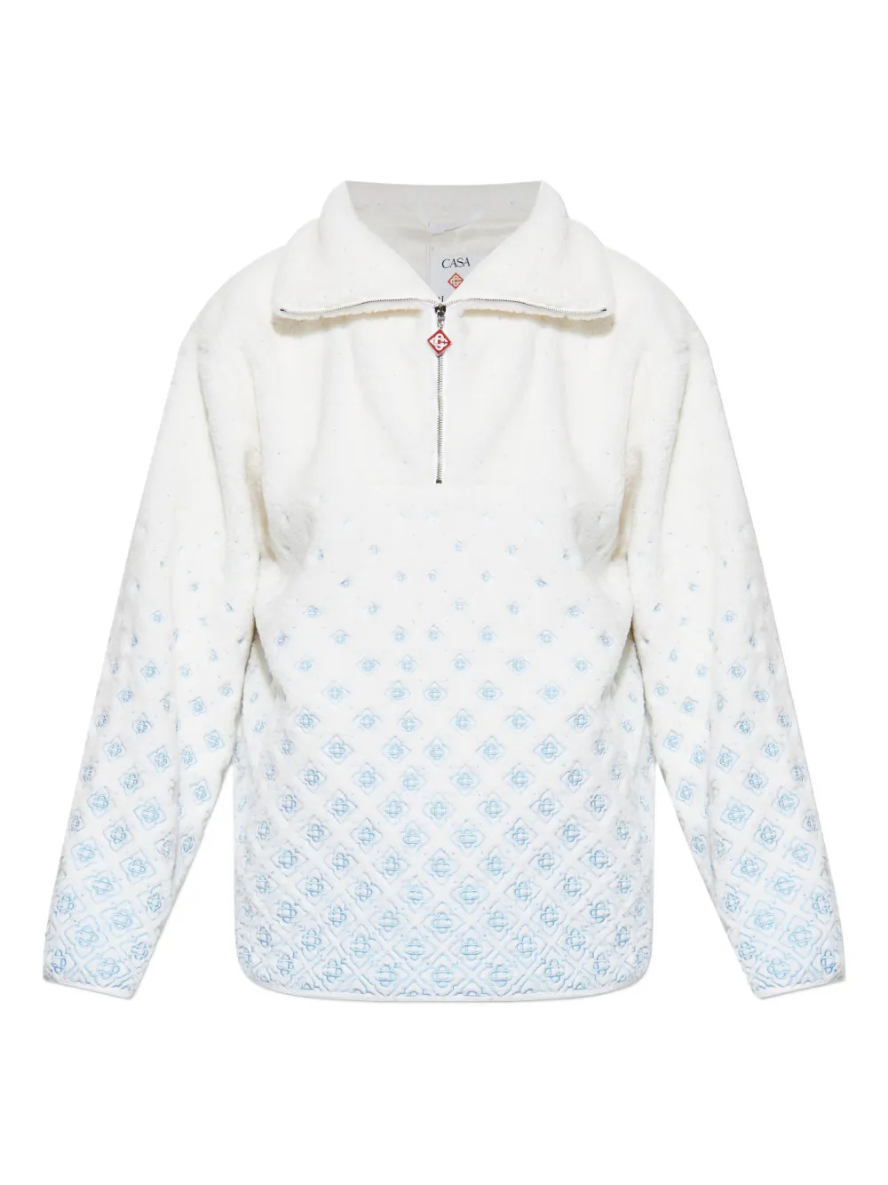 Белый флис с фактурой и узором по всей поверхности, светло-голубая вышивка, высокая горловина, застежка на молнии до половины