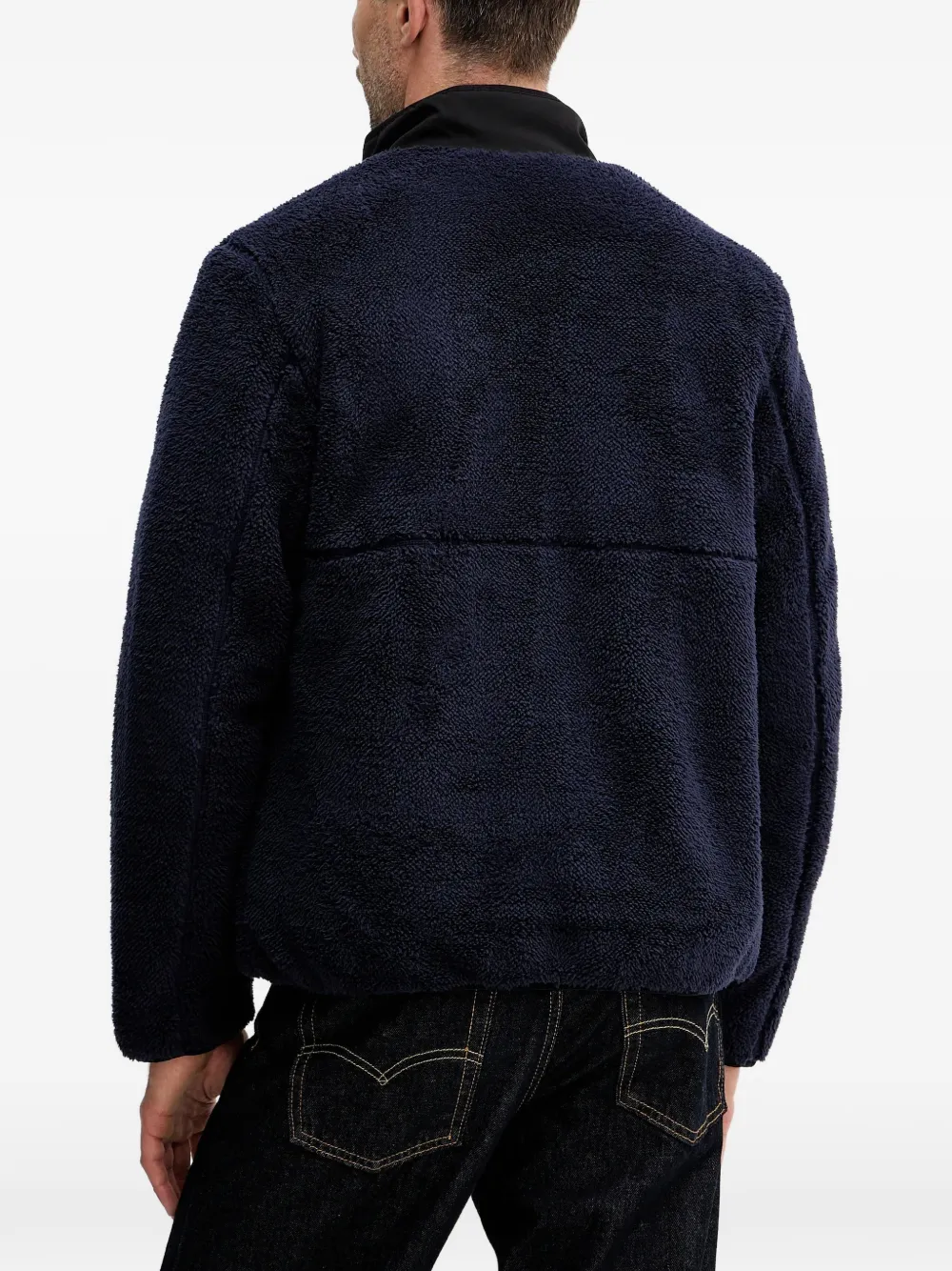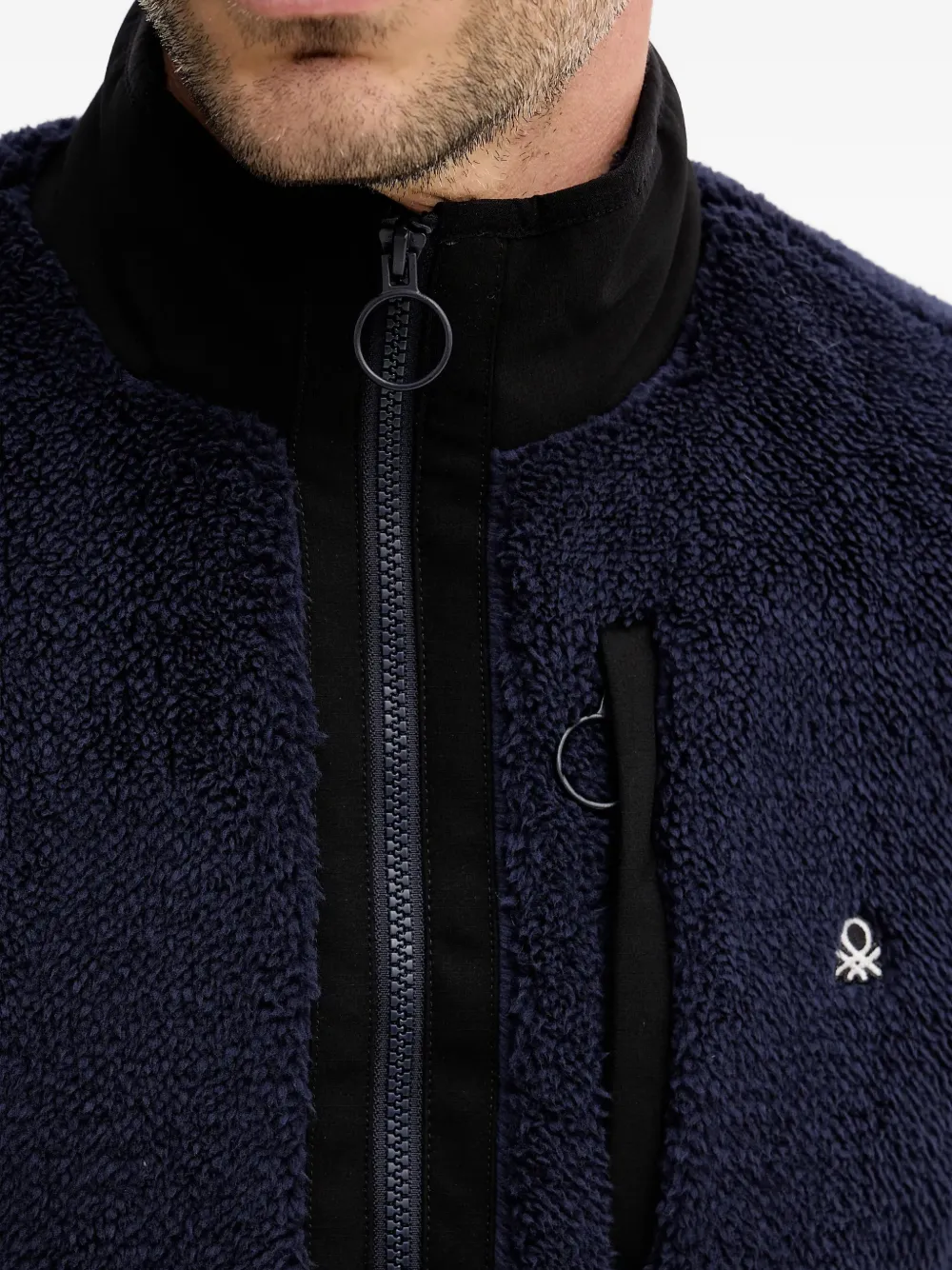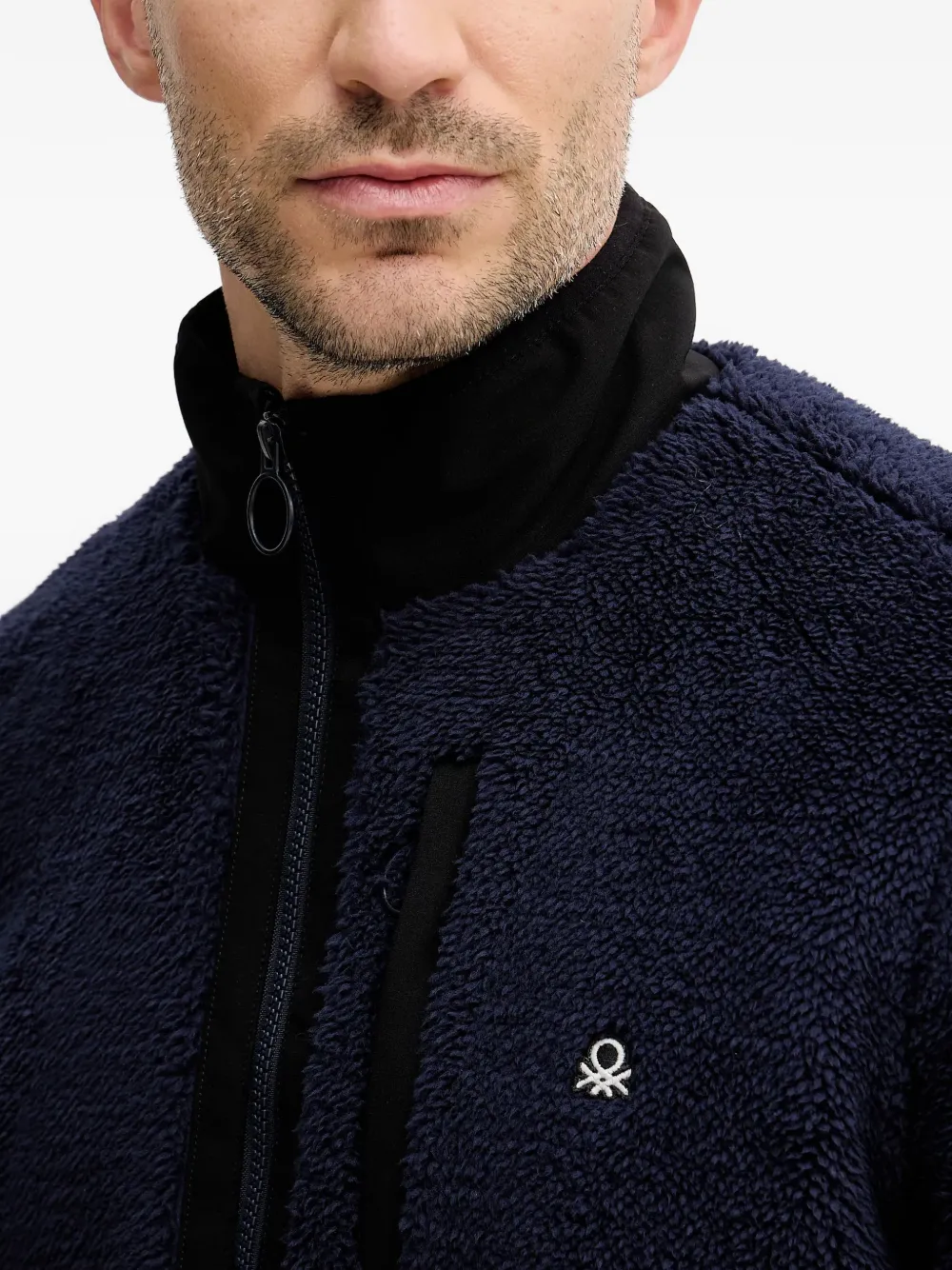 Темно-синий флис, фактурная поверхность, застежка-молния, нагрудный карман, нашивка с логотипом, высокий воротник