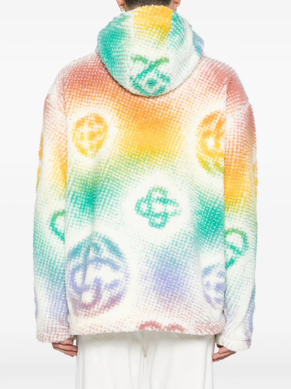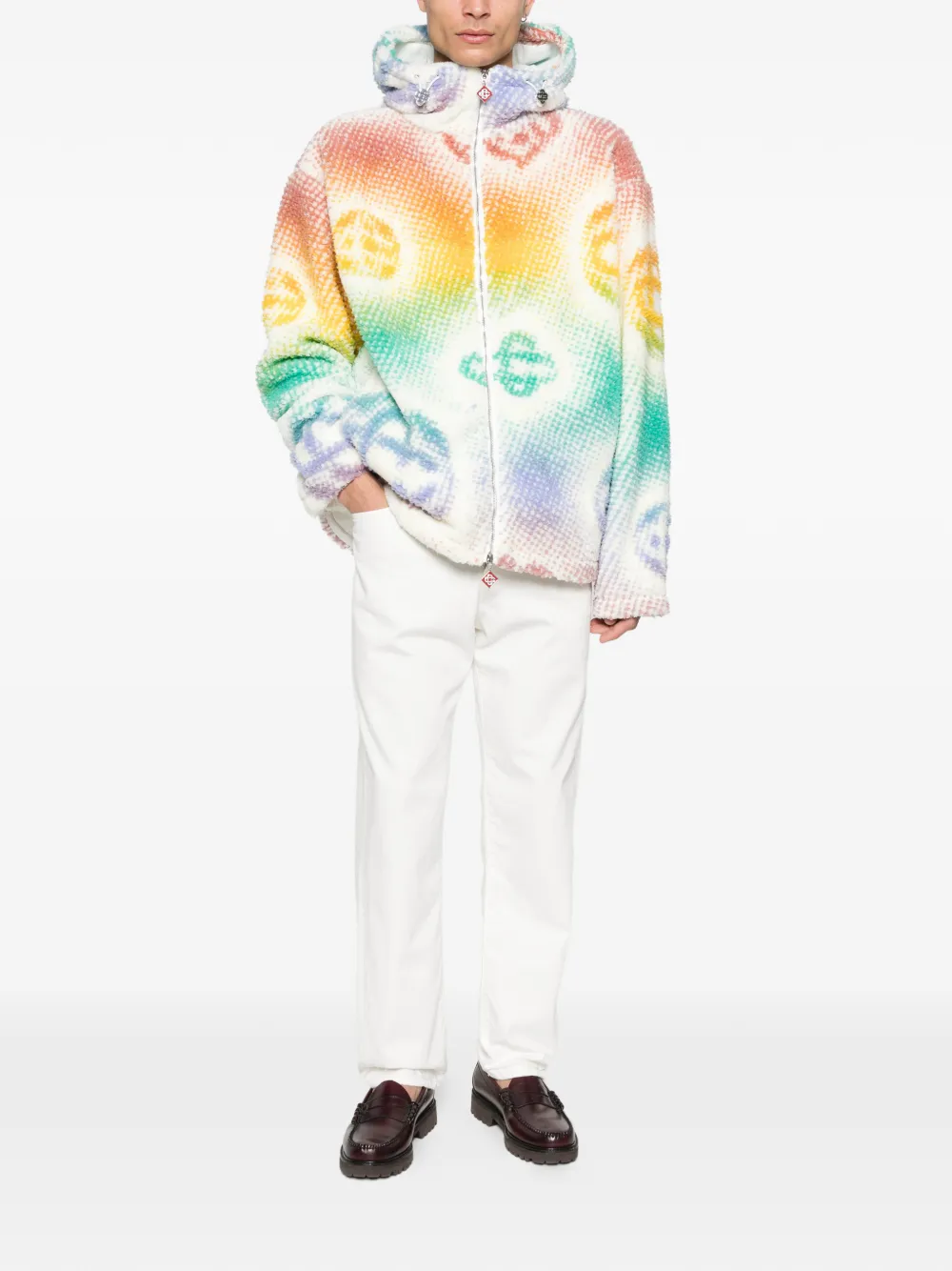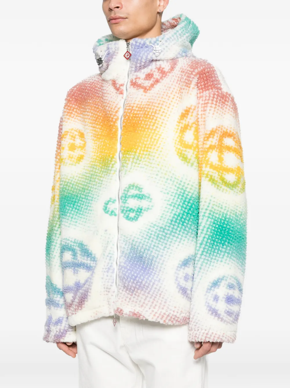 Белая и многоцветная кофта с монограммным узором, застежкой-молнией, капюшоном на шнурке и подвеской-логотипом
