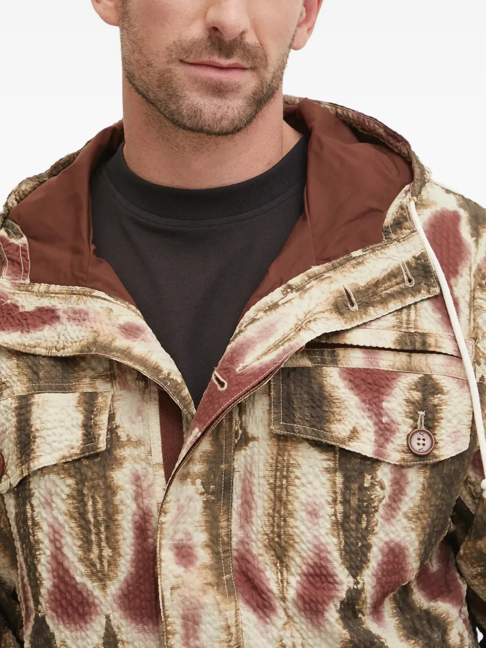 Бежевый цвет, нагрудные карманы с клапанами, капюшон со шнурком