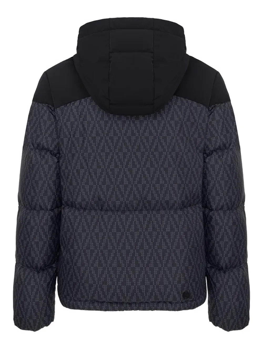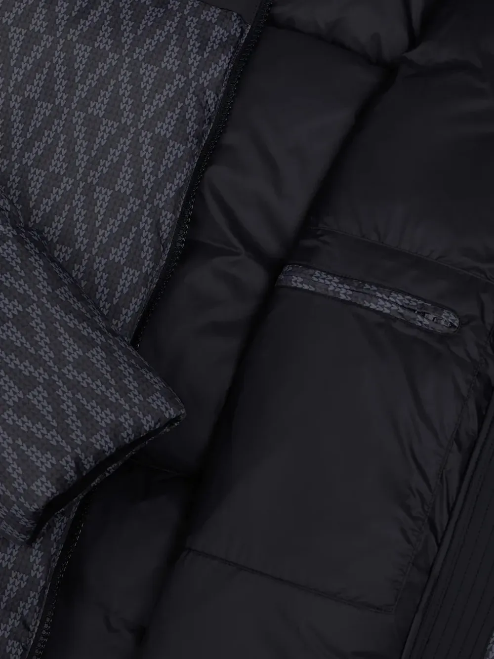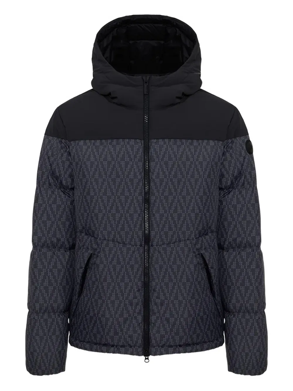 Черная куртка с узором, капюшоном, застежкой-молнией спереди, передними карманами на молнии и нашивкой с логотипом