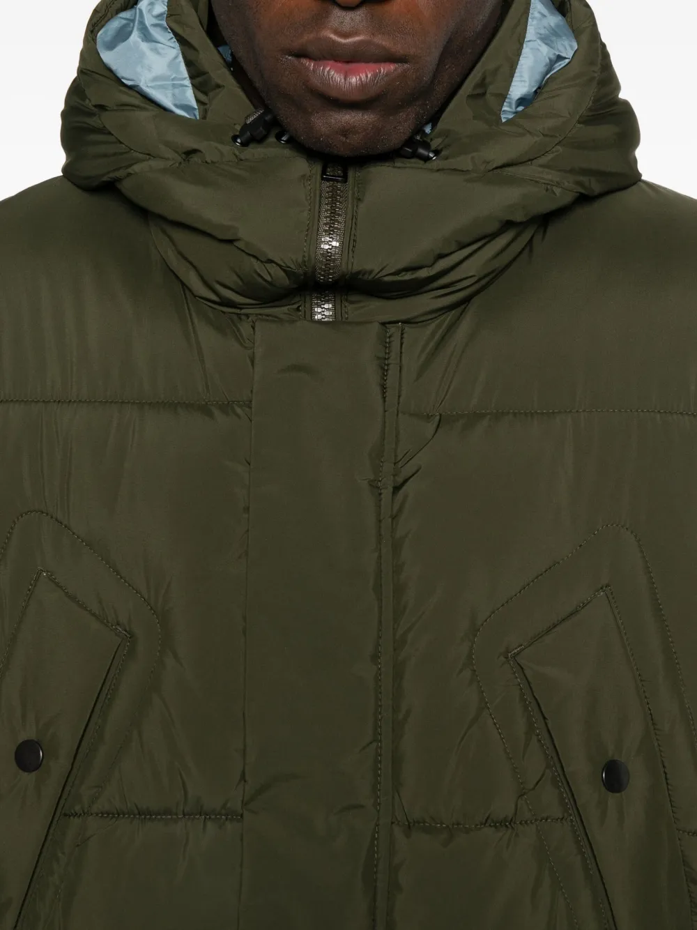 Оливково-зеленый цвет, стеганый дизайн, накладные карманы, застежка на кнопки, капюшон, длинные рукава
