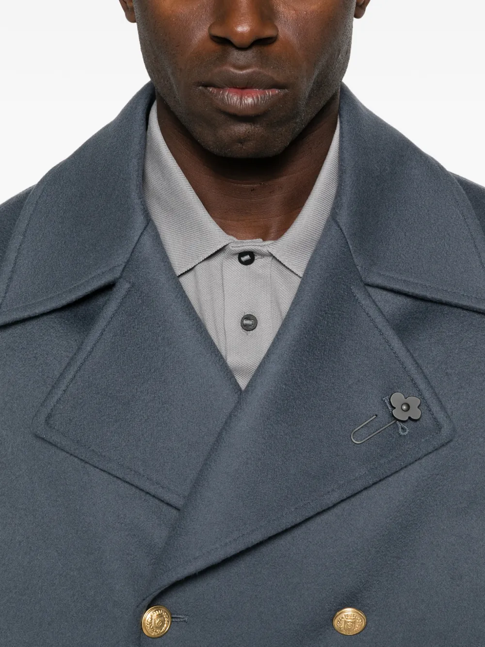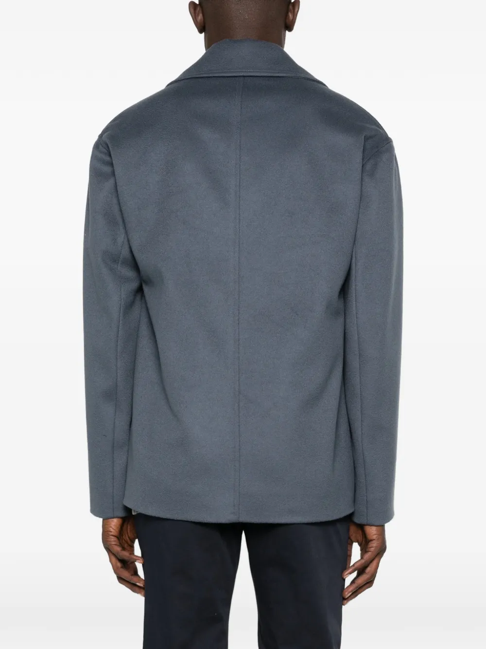 Синий двубортный пиджак с золотистыми пуговицами и лацканами с выемками